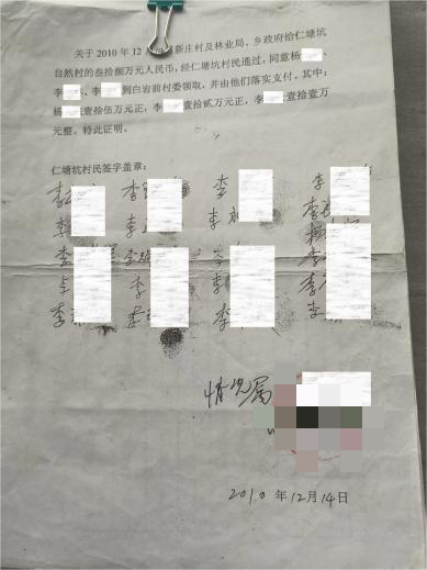 仁塘坑村民小组代表提及,白岩前村村长陈某曾陈述,其出具的相关“送字”证明系受原万阜乡领导成员(后转任林业部门领导成员)季某及林业部门领导成员潘某“指使伪造”;此外,新庄村曾依据上述伪造证明,在该山场砍伐林木上万立方米,最终有四人被采取刑事强制措施、三人被判刑,青田县林业局、万阜乡相关部门、新庄村委三方共同向仁塘坑村赔偿38万元。村民小组认为,上述相关事实进一步印证了其对“驮仰”山场的原始权属主张。