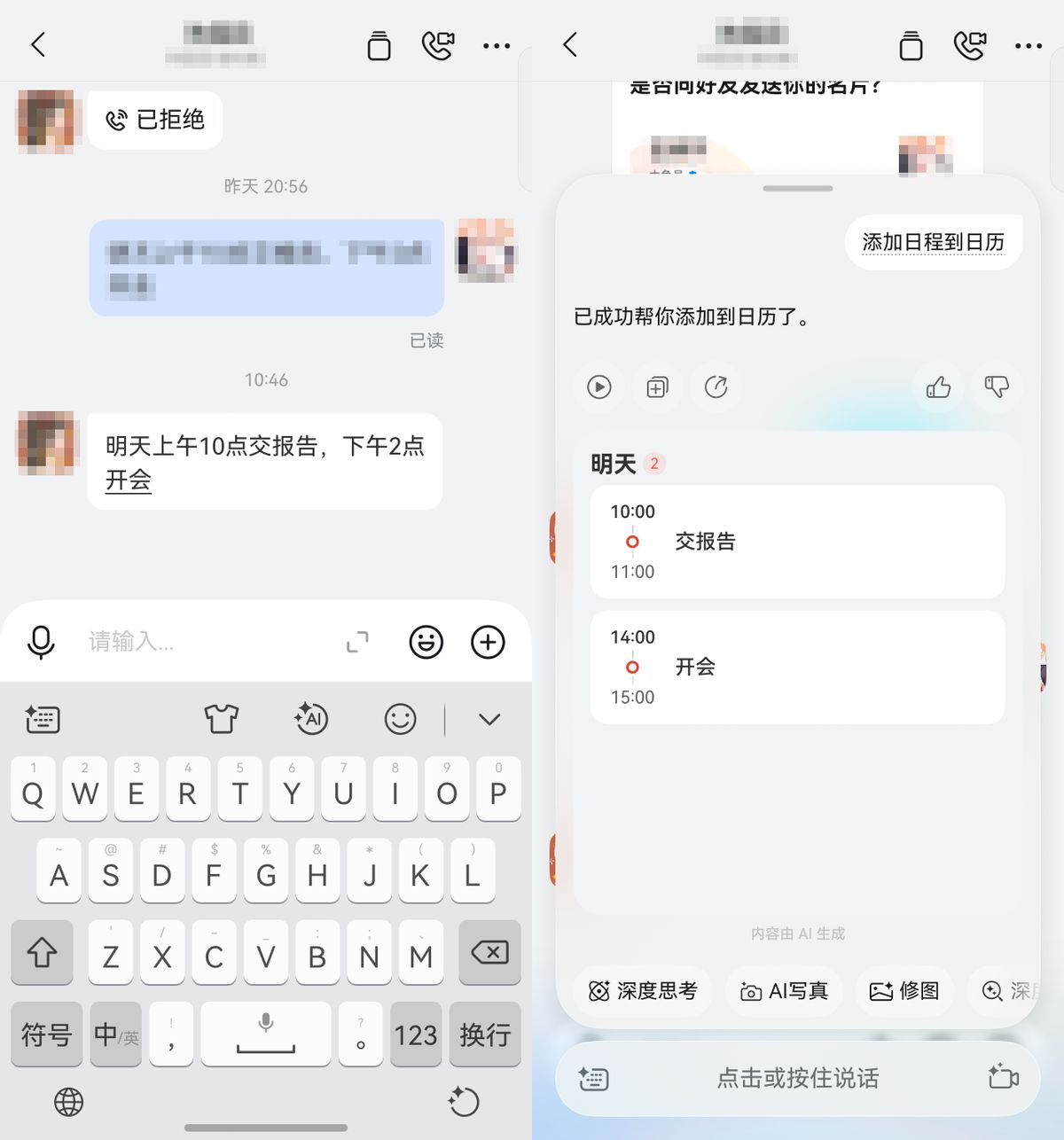 更省事的还得是“拖给小艺进行深度分析”,这个功能的覆盖场景是真的广。上周我在鸿蒙版钉钉里收到同事发来的工作安排,我长按文字往下一拖,直接“投喂”给小艺。只要几秒钟,小艺就把几点的会议、哪天交报告给列得清清楚楚,还能直接添加日程到系统日历,省了我好多事。