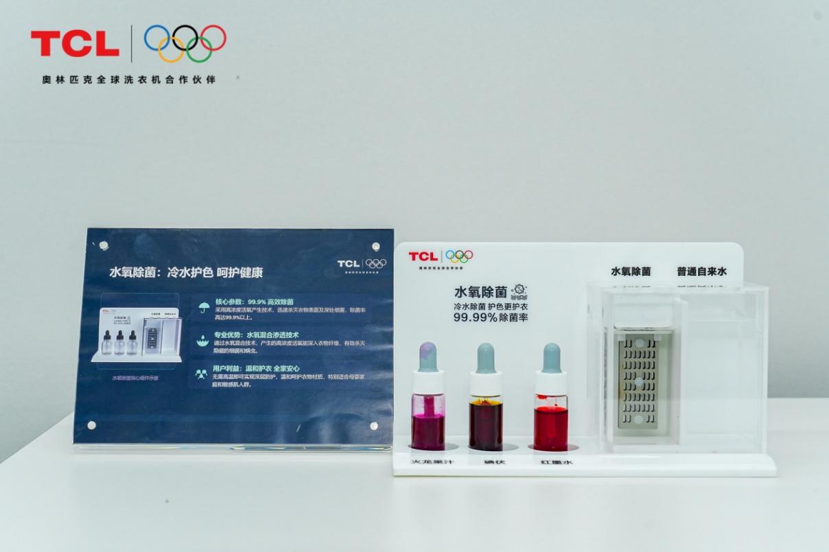 如果说超级筒是T7W Ultra的“洁净核心”,那水氧除菌技术就是它的“健康护盾”,这也完美匹配了当下家庭洗护的健康刚需。在现场,工程师对比了传统高温除菌和化学除菌的痛点。高温易损伤衣物纤维、导致变形,化学药剂易残留、易让衣物掉色,这些虽然可以满足健康除菌的需求,但却无法兼顾护衣的要求。而TCL创新性的采用了水氧除菌,通过采用冷水物理除菌方式,内置水氧装置电解产生活性双氧水,无需加热、无化学添加,就能实现全方位除菌。