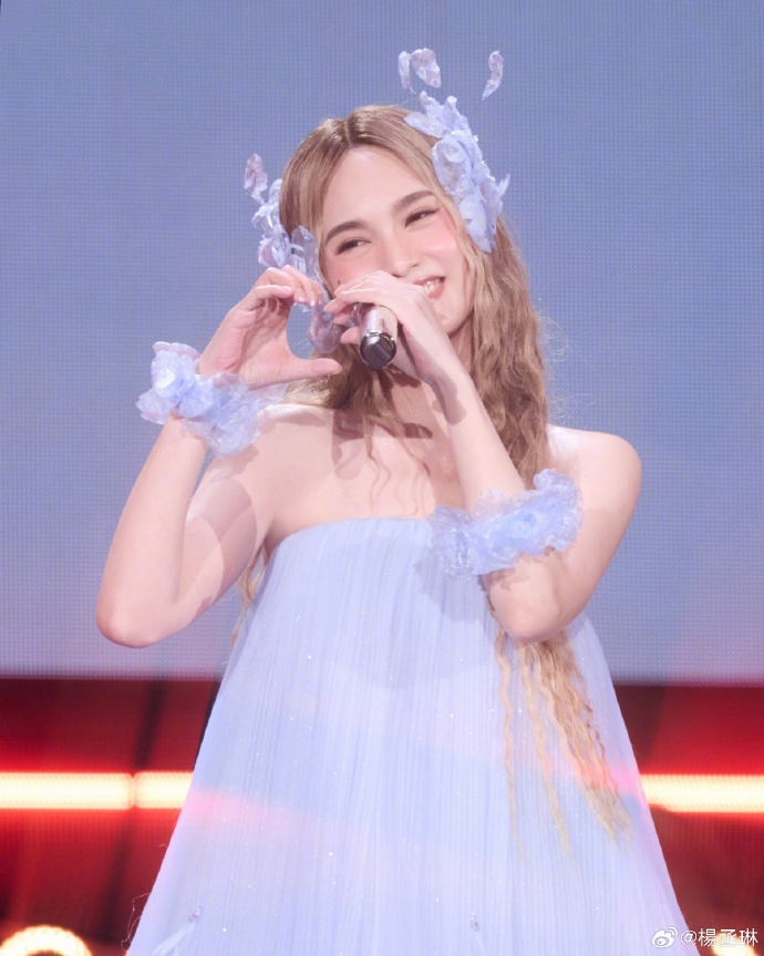 她举着话筒抬臂,礼服的裙摆跟着动作轻扬,发丝被舞台风吹得往后飘。这是她舞台上熟悉的 “用力” 姿势,可裹在白纱裙里,连抬臂的锐感都软了些,像把 “耗尽心力” 的奔赴,变成了带着温柔的舒展。她说 “所有付出都值得”,这抬臂的动作里,就是值得的样子。