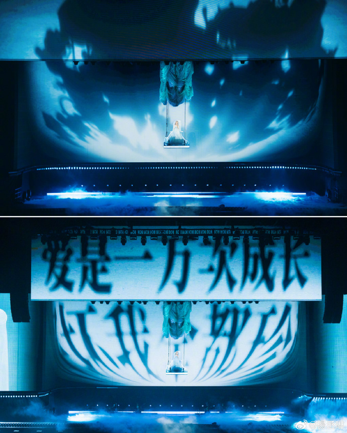 她坐在悬起的秋千上,穿的礼服是蓝白渐变的纱质,裙摆堆出软蓬的弧度,像把浅淡的星空揉进了裙身。上一轮巡演的舞台装偏利落短款,这次选了秋千这种柔缓的装置,连礼服的纱都软得能接住舞台光。她说这场是 “巨大的考验”,可坐在秋千上的她,连裙摆的褶皱都跟着光软下来,一点没有 “考验” 的紧绷,只有舞台里的松弛。