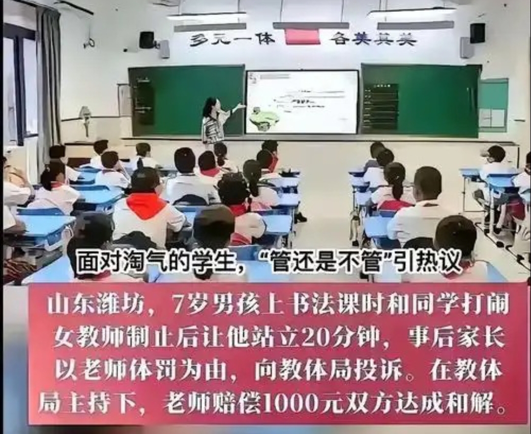 山东的案例更令人心寒:7岁男孩书法课打闹,老师制止后罚站20分钟,竟被家长投诉“体罚”。教育局调查后认定老师方法不妥,不仅给予处罚,还要求赔偿1000元。