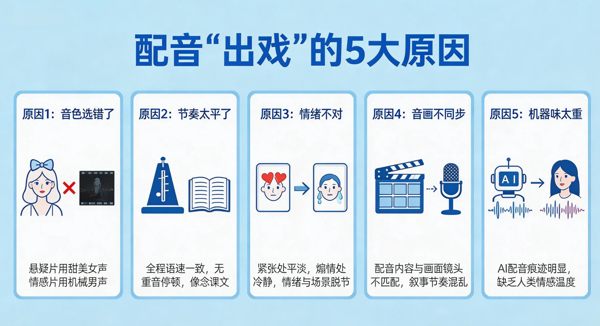 二、配音"出戏"的5大原因先别急着学技巧,先搞清楚你的配音为什么"出戏"。