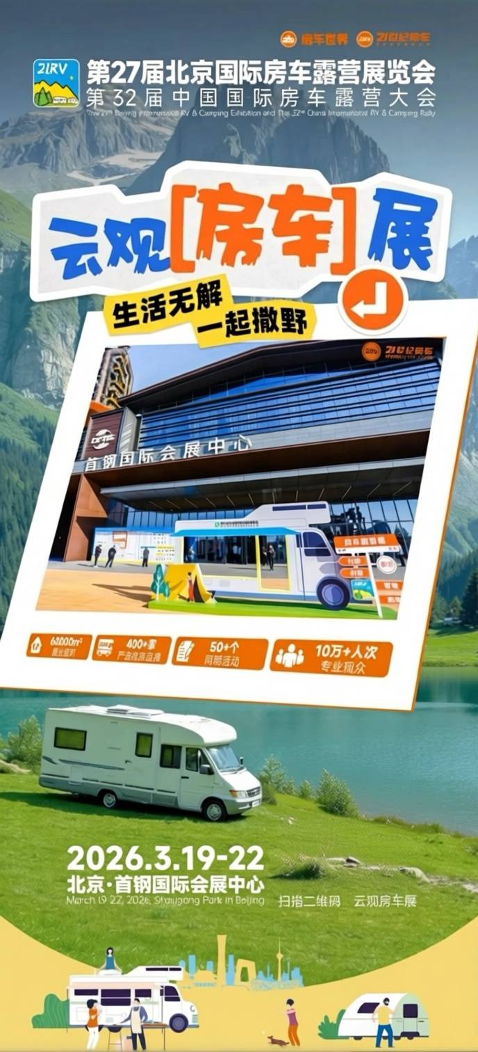 敬请广大观众和行业同仁莅临参观指导,共同见证这一盛况!2026年3月19日-3月22日,第27届北京国际房车露营展览会暨第32届中国国际房车露营大会,北京·首钢国际会展中心,我们不见不散!