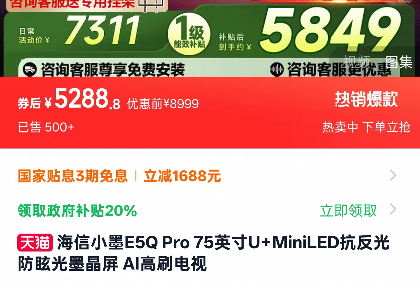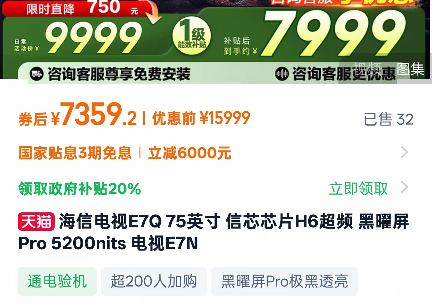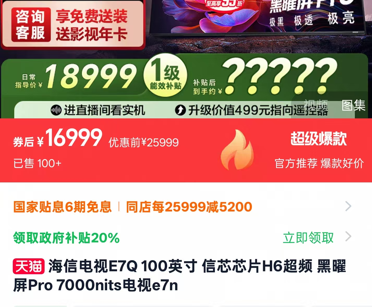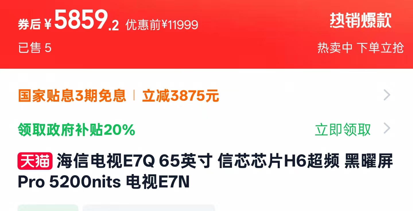 天猫这边,海信E7Q的价格和京东互有高低,我找到的好价(叠加国补后)为:5859.2元(65寸)、7359.2元(75寸)、9199元(85寸)和16999元(百寸),同样送安装,另外下单前咨询客服或许还有其他惊喜!