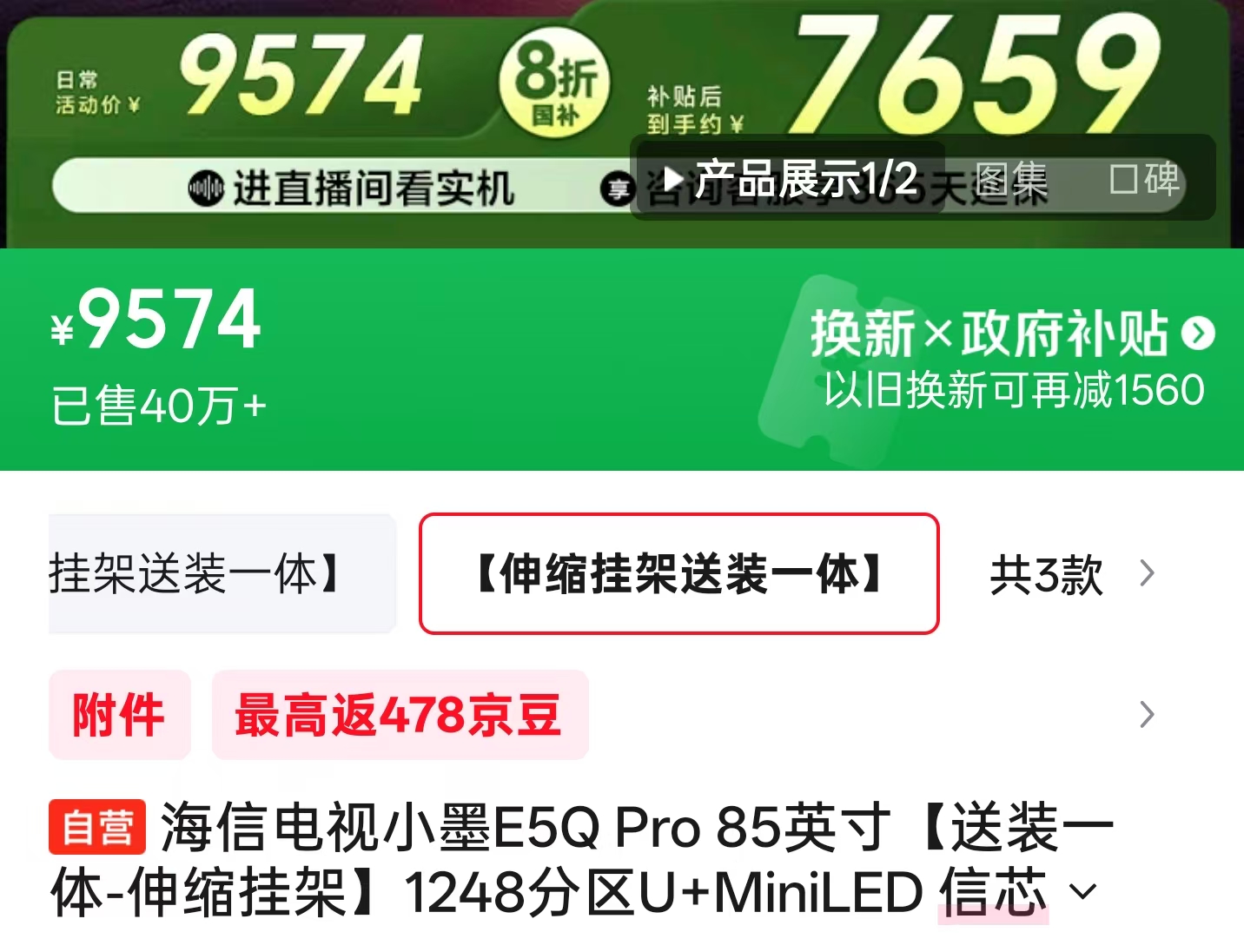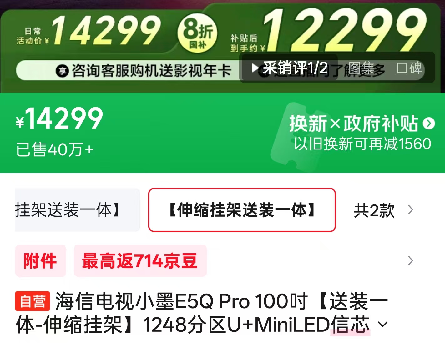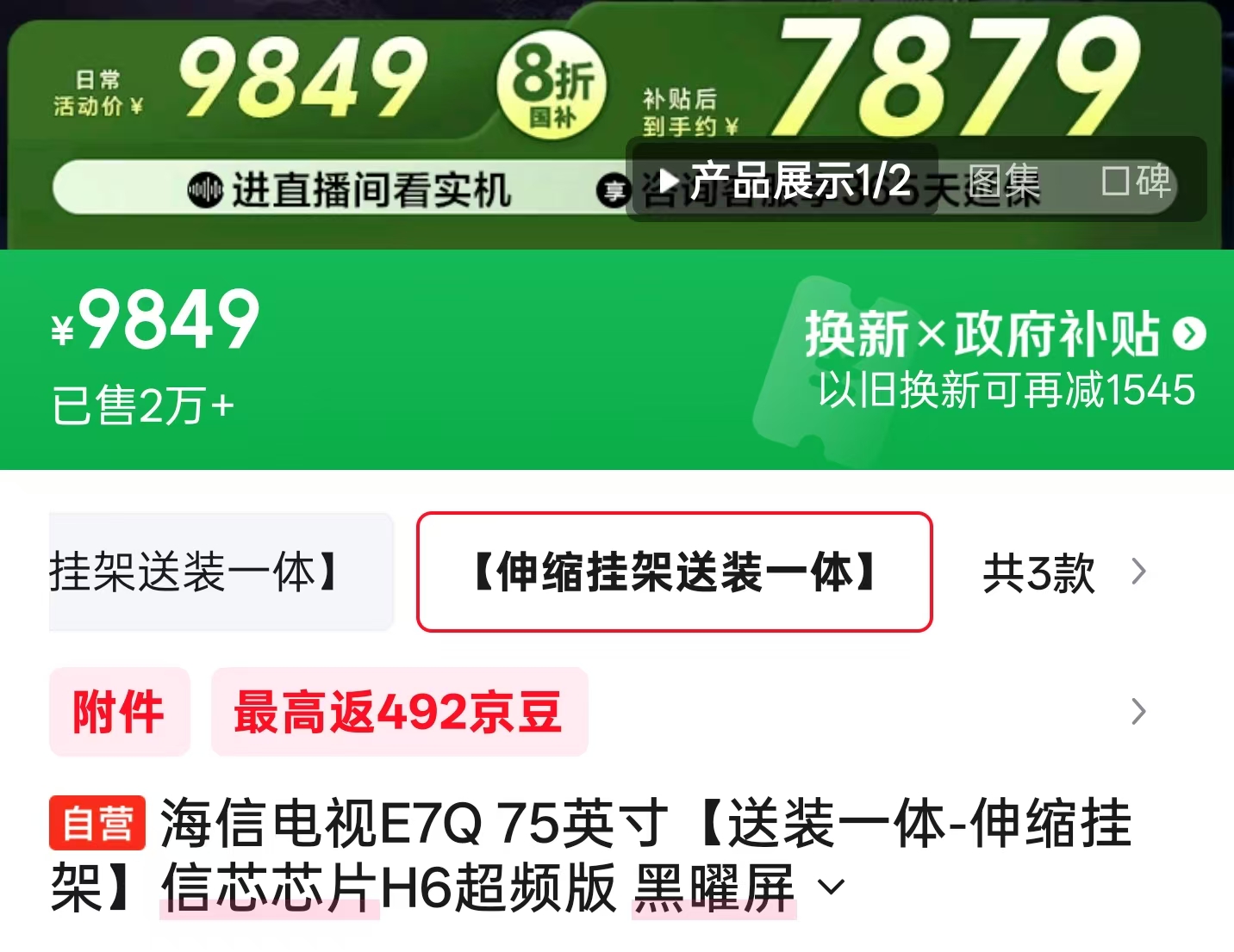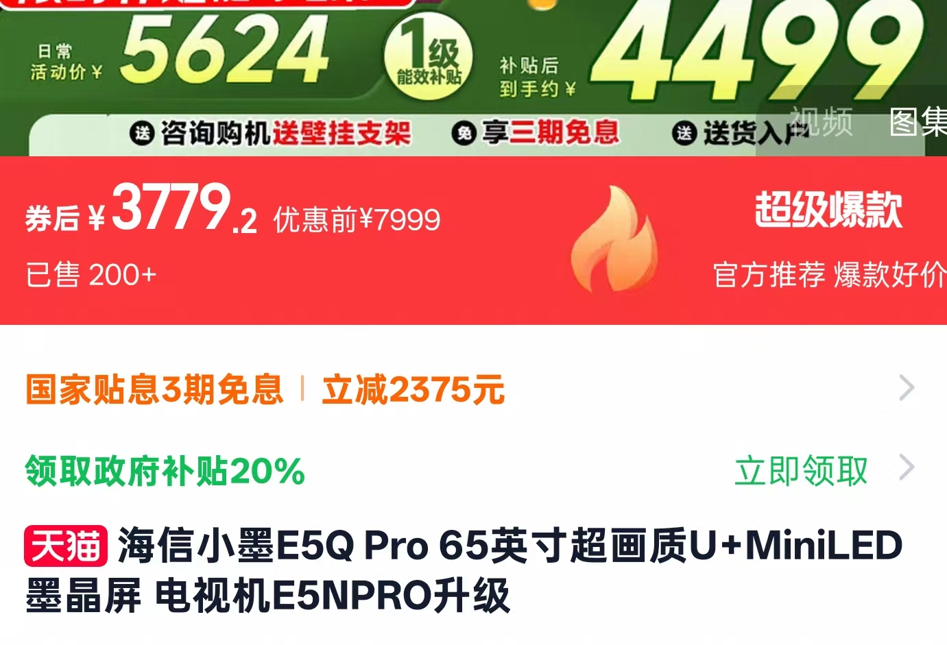 天猫这边,海信E7Q的价格和京东互有高低,我找到的好价(叠加国补后)为:5859.2元(65寸)、7359.2元(75寸)、9199元(85寸)和16999元(百寸),同样送安装,另外下单前咨询客服或许还有其他惊喜!