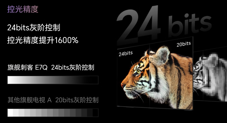 控光精度——它意味着电视背光系统在控制亮度时所能达到的精细程度,这个数字越大,代表电视在调节光线明暗时的“刻度”越精细,能实现更平滑、细腻、无突变的亮度过渡。E7Q的控光精度达到了24bits,也就是1680万层级,比Q10L高了整整一倍。