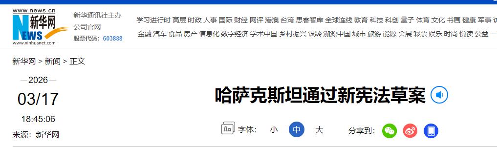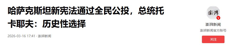 参考信息2:《哈萨克斯坦新宪法通过全民公投,总统托卡耶夫:历史性选择》澎湃新闻2026.03.16