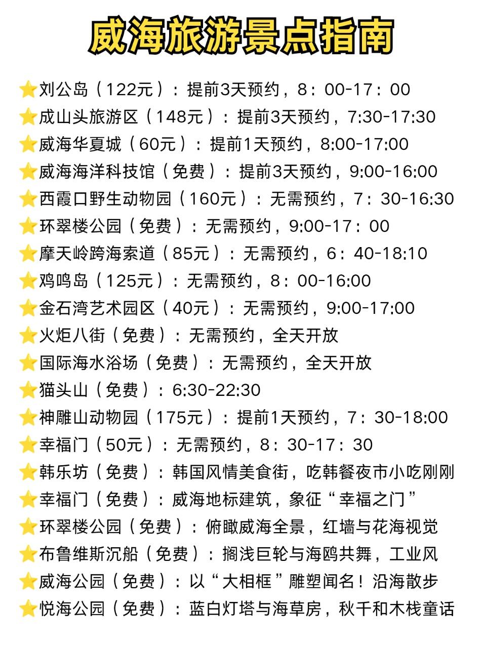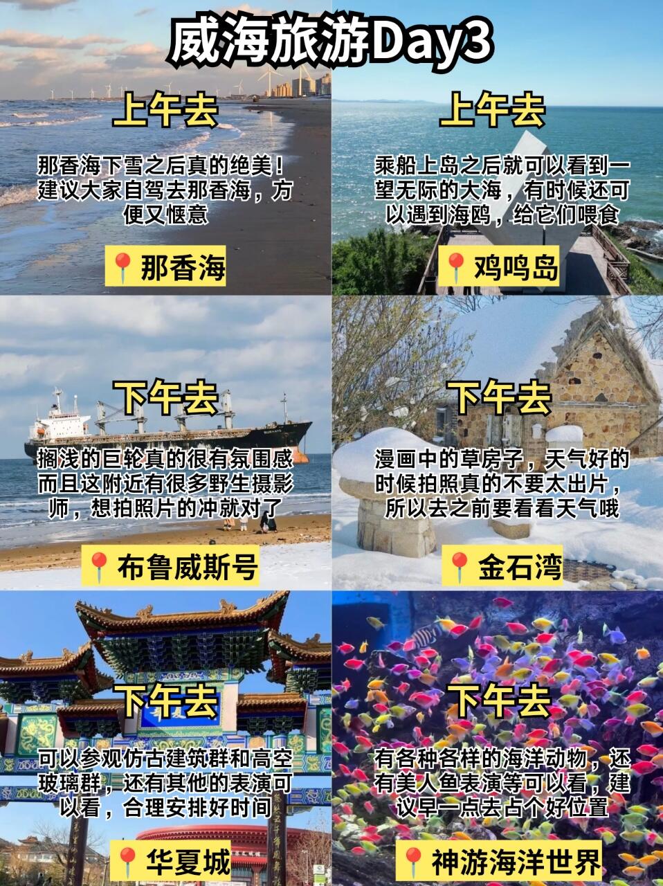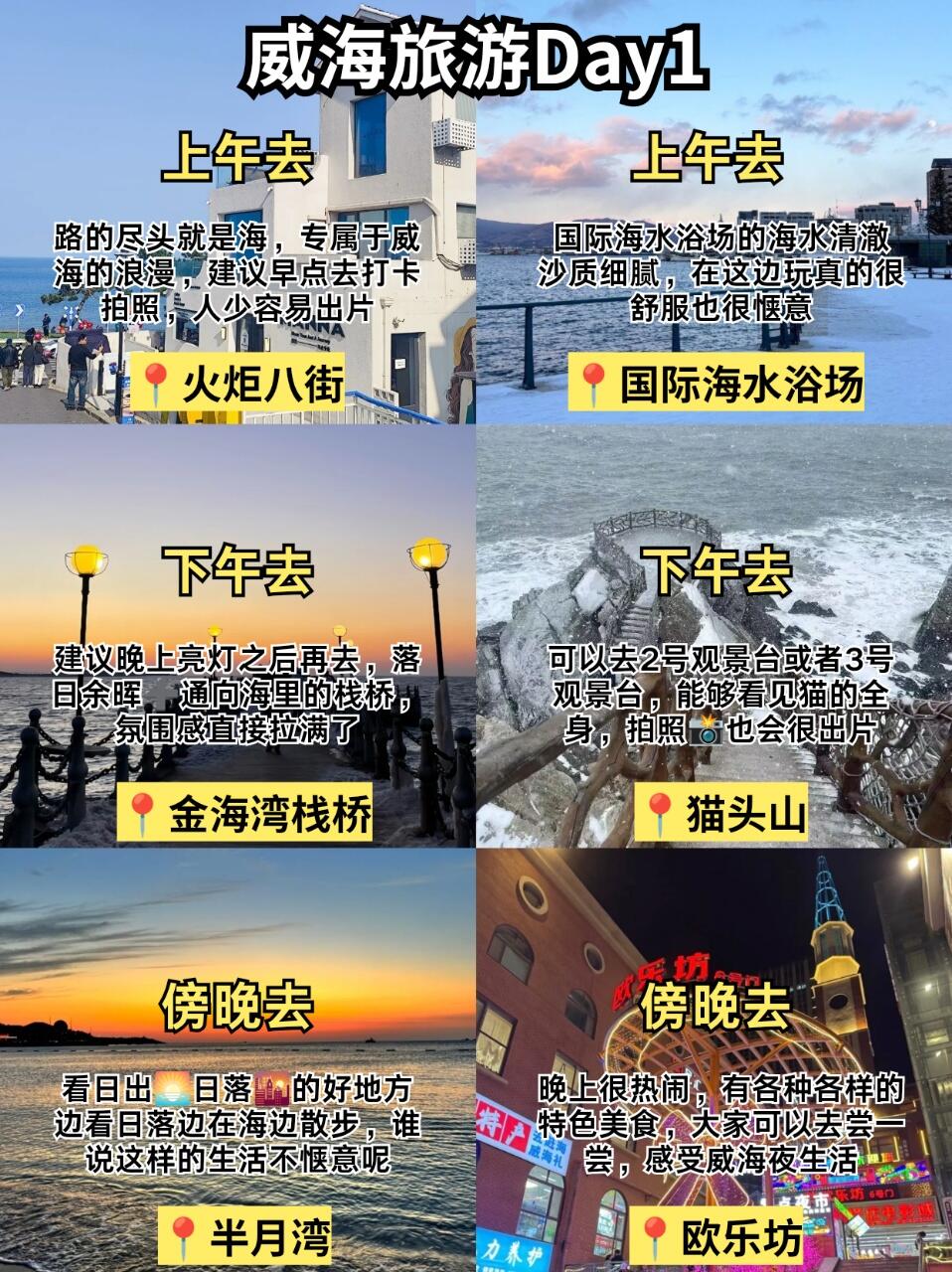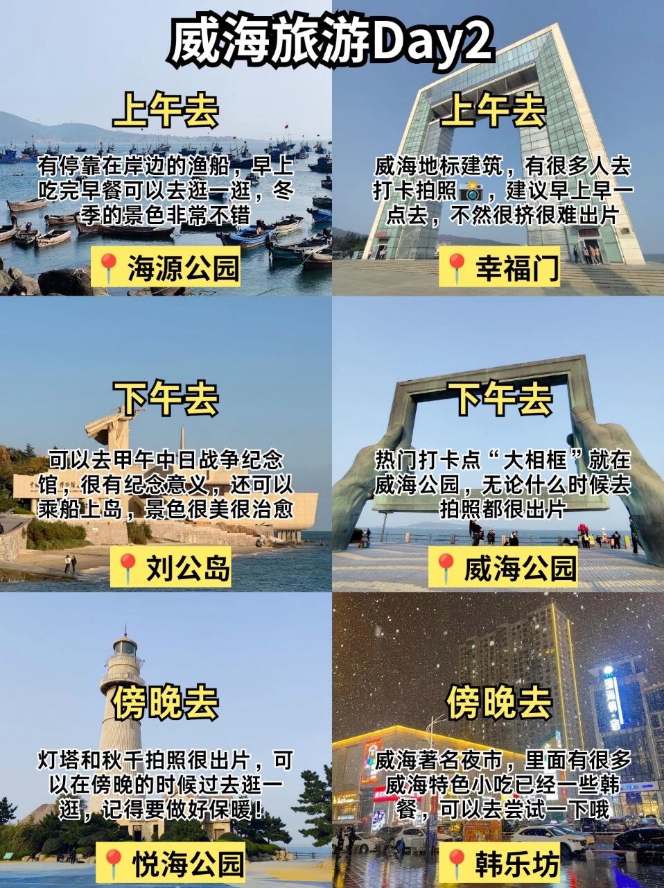 ‼️威海冬季日均zui低温度可能会到零下几度,zui高温度在10℃左右。海风比较凉,早晚温差明显,需要穿防风外套🧥做好保暖。下雪❄️之后威海就比较寒冷了,日均最低温度在-2℃左右,夜间温度常常会降至零下,部分日子还会下雪🌨️,这时候就得穿羽绒服、厚棉鞋等,所以来威海旅游的姐妹👭们一定要多带保暖衣物✅