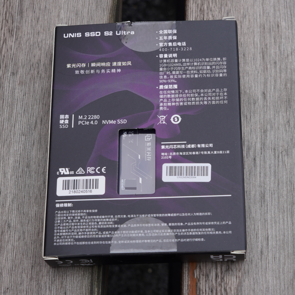 这款紫光闪存UNIS SSD S2 Ultra(1TB)的包装盒以紫、黑、白三色为主,科技感十足。