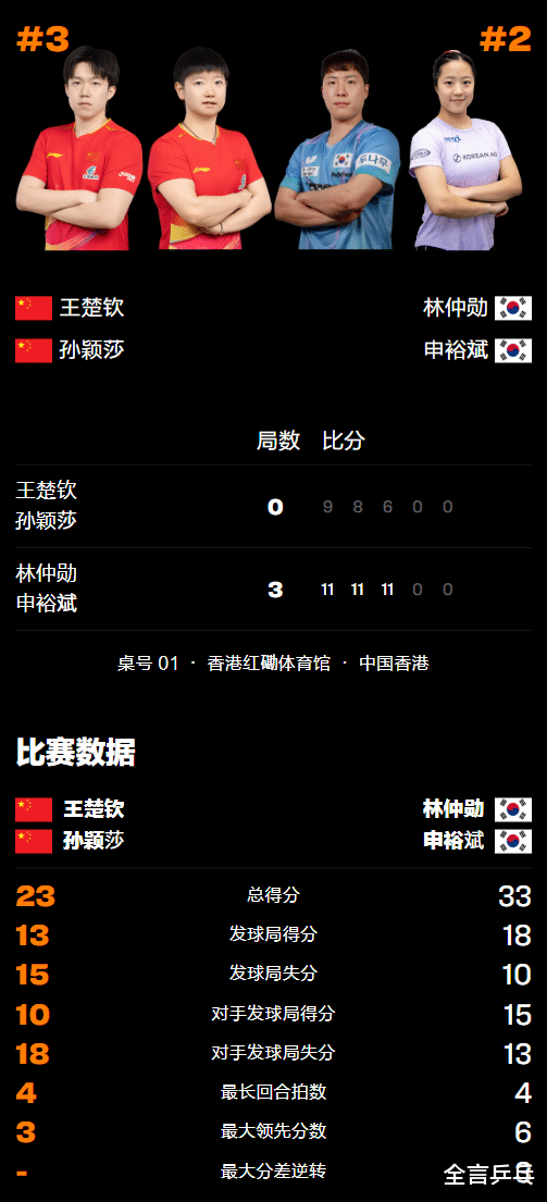北京时间2025年12月13日晚,乒乓球WTT香港总决赛的首场决赛落下帷幕,中韩主力组合王楚钦/孙颖莎、林钟勋/申裕斌狭路相逢,展开激战,结果带伤出战的孙颖莎未能恢复状态,最终与王楚钦一起0-3落败,林钟勋/申裕斌由此而连赢两对中国选手夺得冠军,详细战况请看下文。