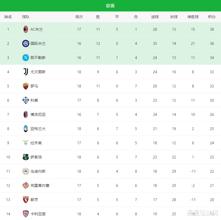 随着这两场比赛结束,意甲积分榜的格局也逐渐清晰。AC米兰先赛领跑国际米兰2分,占据主动;尤文和罗马同时掉链子,争冠与争四形势开始收紧;而亚特兰大的这场胜利,则让欧战区的竞争重新燃起悬念。从目前意甲积分榜来看,争冠与争四开始出现的分水岭,竞争相当的残酷!