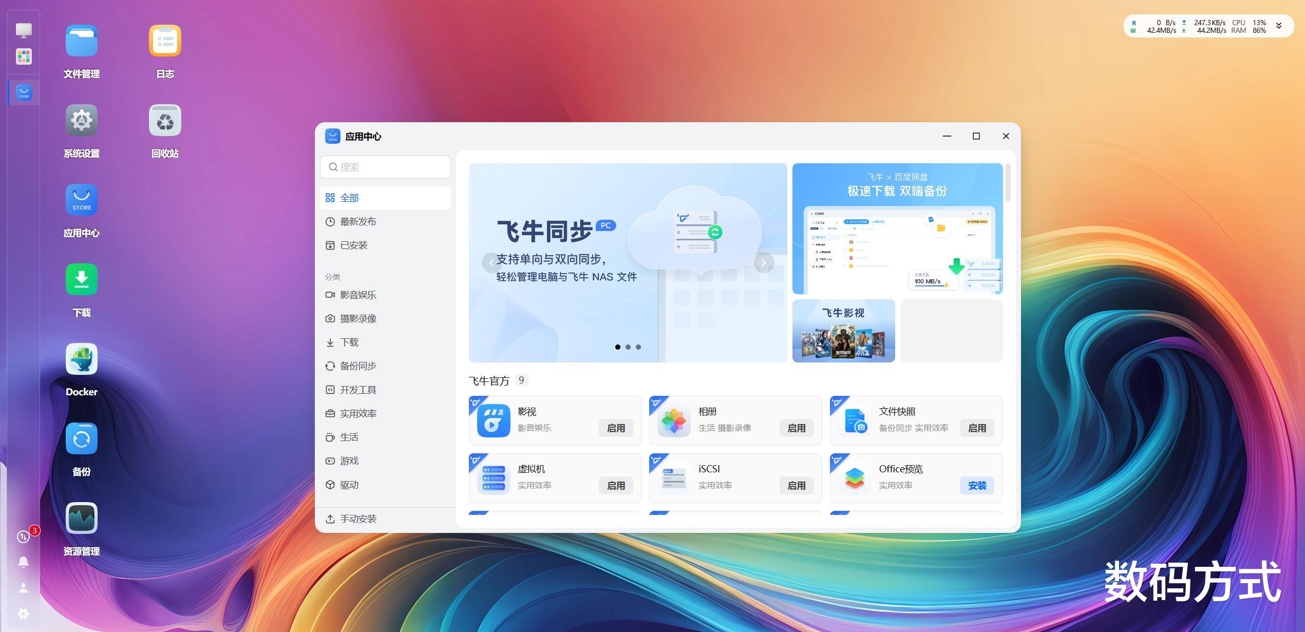 首先说说飞牛影视功能——只要将电影文件放入指定目录,系统就会自动匹配海报墙,直接系统化的解决了影视分类问题以及不好找的问题。而手机App的设计人性化,UI简洁直观,主界面就能完成资源监控、Docker管理等操作,大部分应用还支持自定义位置,使用起来非常顺手。