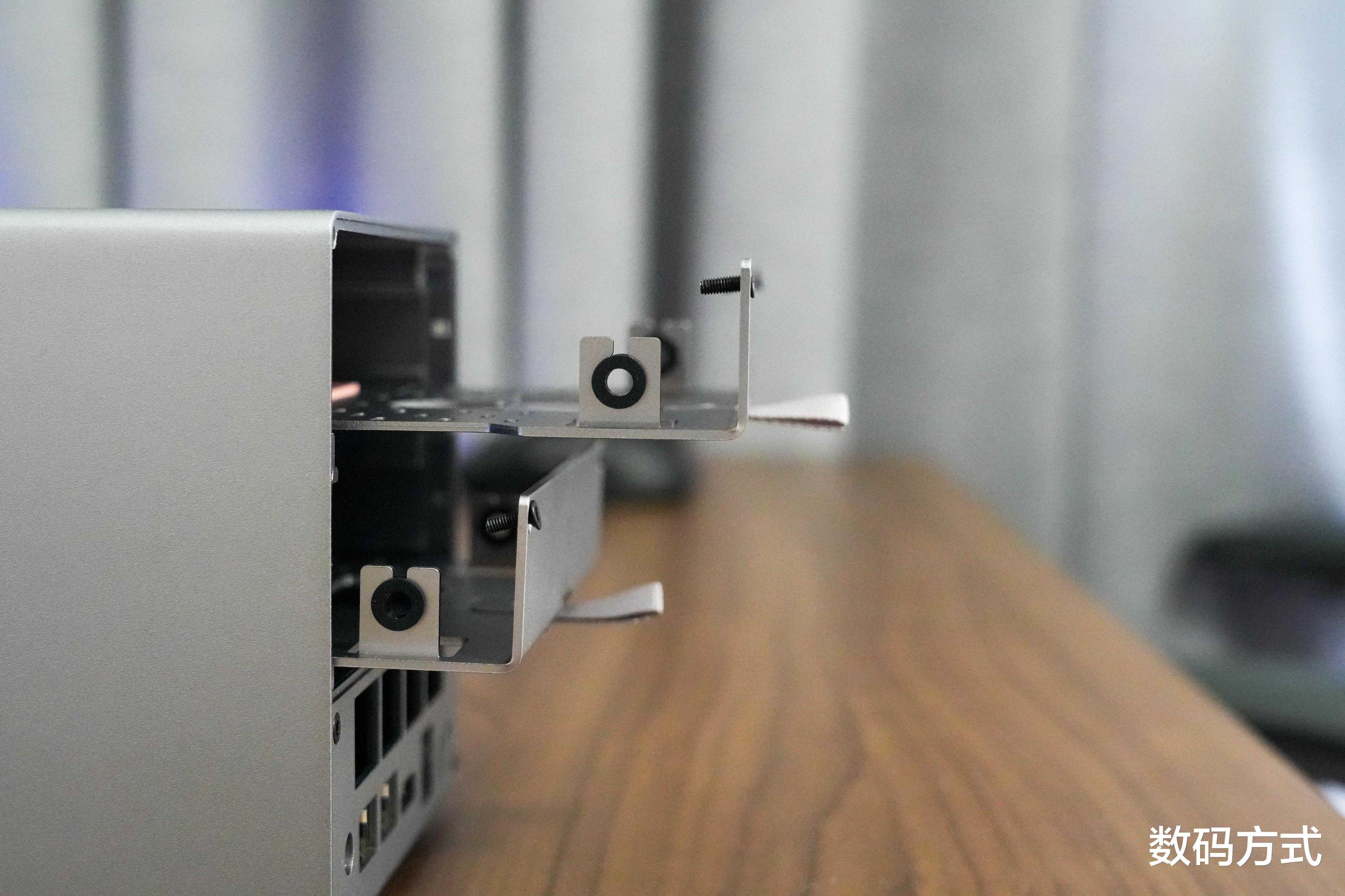 全金属的硬盘支架通过卡轨+螺丝固定,硬盘与支架间贴心地配备了弹性硅胶垫片,既能减震又能辅助散热。而最颠覆性的设计是“主板抽屉”——拧下固定螺丝,整个主板模块可以直接抽出,通过PCIe插槽与SATA背板连接。这意味着未来的硬件升级将变得非常简单,无论是维护还是升级,都不再需要复杂的拆机过程,这也是这款NAS我认为颠覆性的设计,让硬件不再只可以是出厂模式,这对于长期使用绝对是一个利好设计。