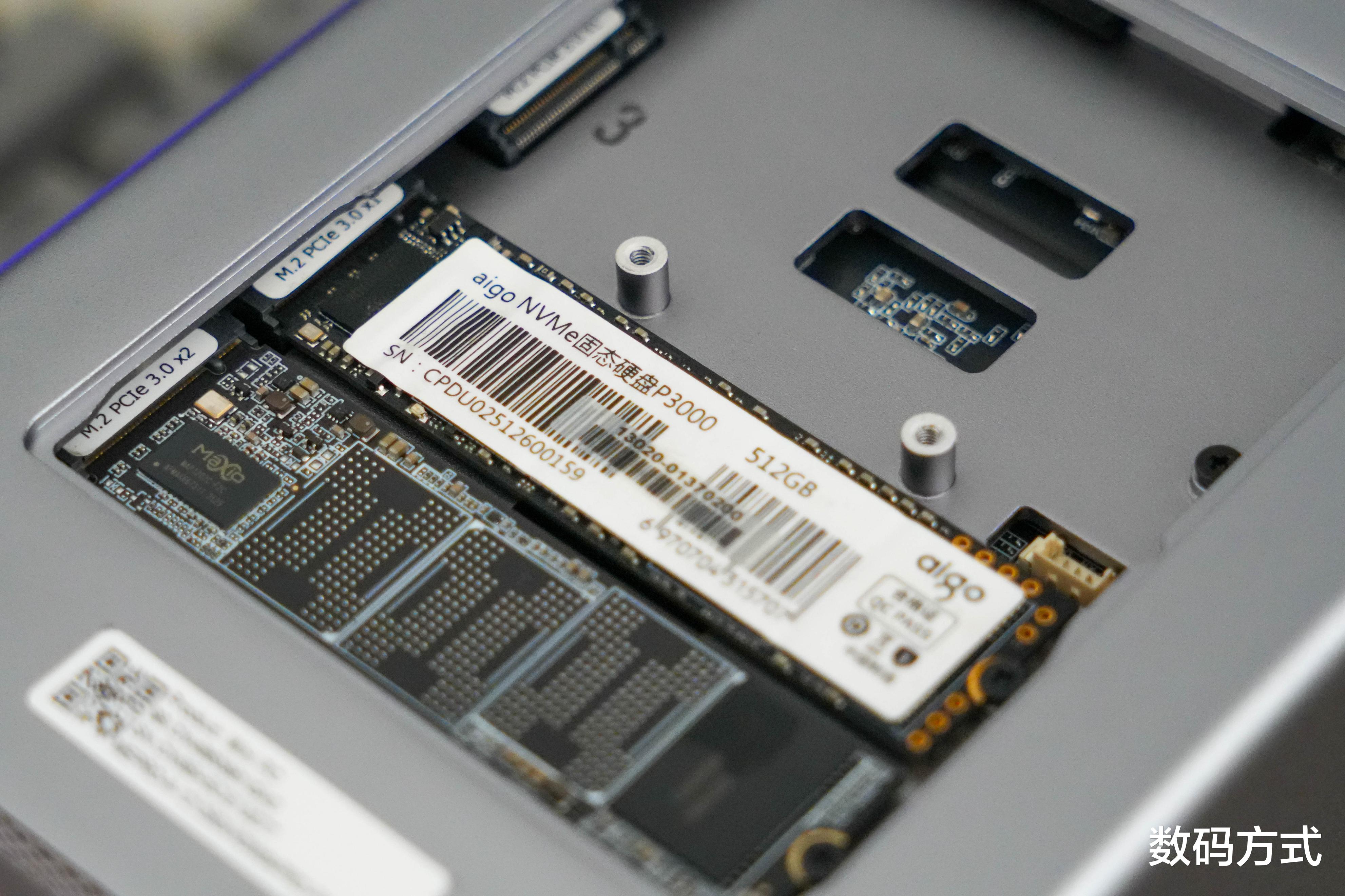 存储扩展方面,ME Pro同样诚意满满:除了两个3.5英寸SATA盘位,底部还配备了三个M.2 2280插槽(1个PCIe 3.0×2 + 2个PCIe 3.0×1),且全部预贴了导热硅胶垫。这意味着你最多可以扩展五块硬盘,对于家庭用户来说完全足够日常使用了。