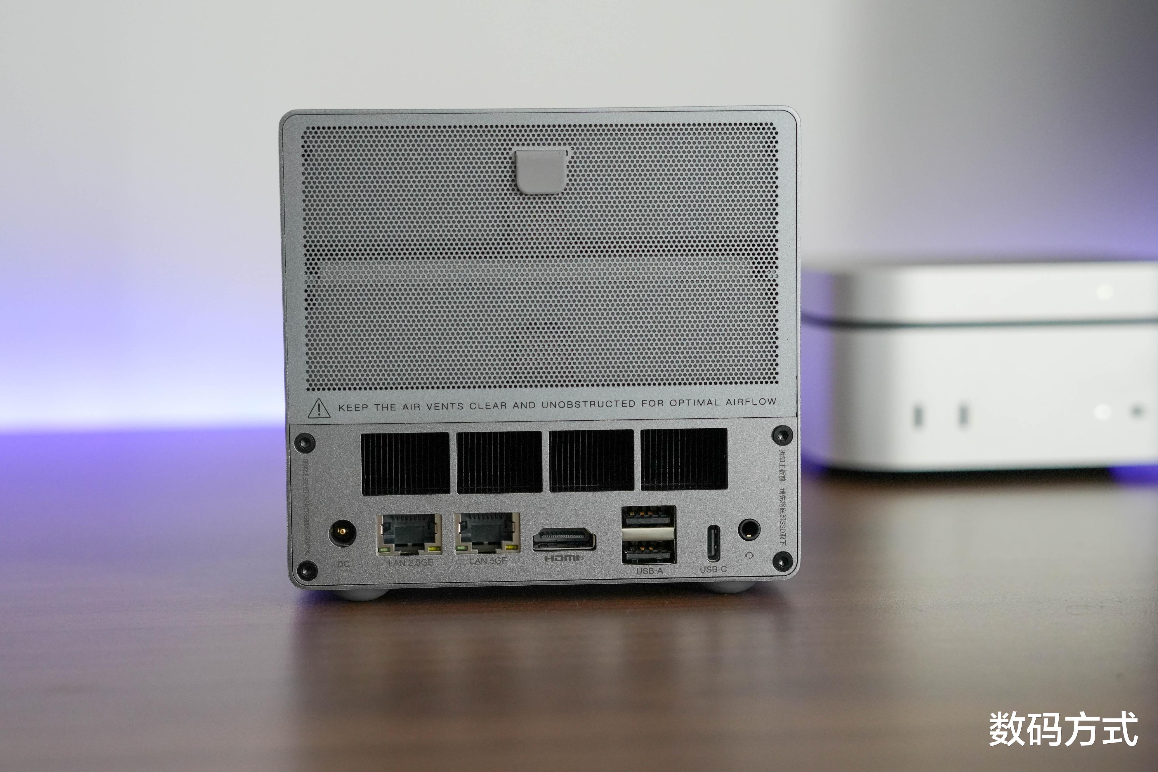 转到背面,磁吸式防尘网轻轻一提就能取下,两个硬盘位排列整齐。最让人惊喜的是接口阵容:5GbE+2.5GbE双网口、两个USB 2.0、HDMI 2.1 TMDS、支持视频输出的10Gbps Type-C接口,还有3.5mm音频口。这样的配置放在如此小巧的机身里,很少见,典型的小巧但很全能。