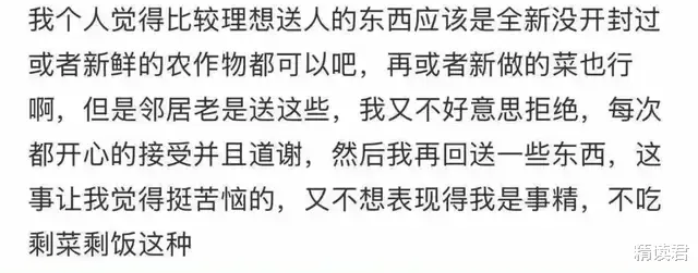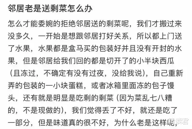 有帖主在社交平台发帖提问:怎么才能委婉拒绝邻居送的剩菜呢?