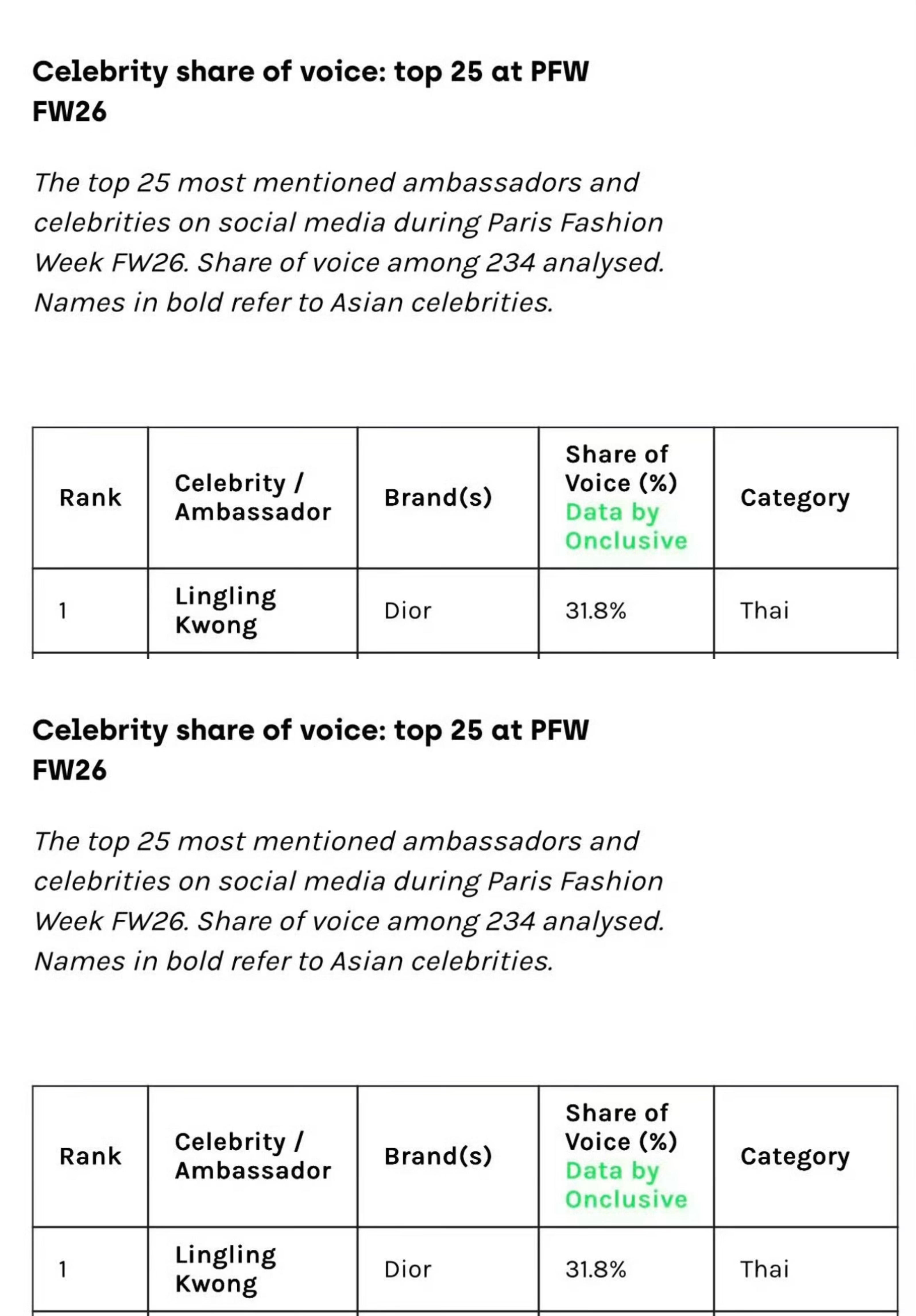 邝玲玲巴黎时装周名人声量第一邝玲玲巴黎时装周FW26 名人声量以31.8% 占据