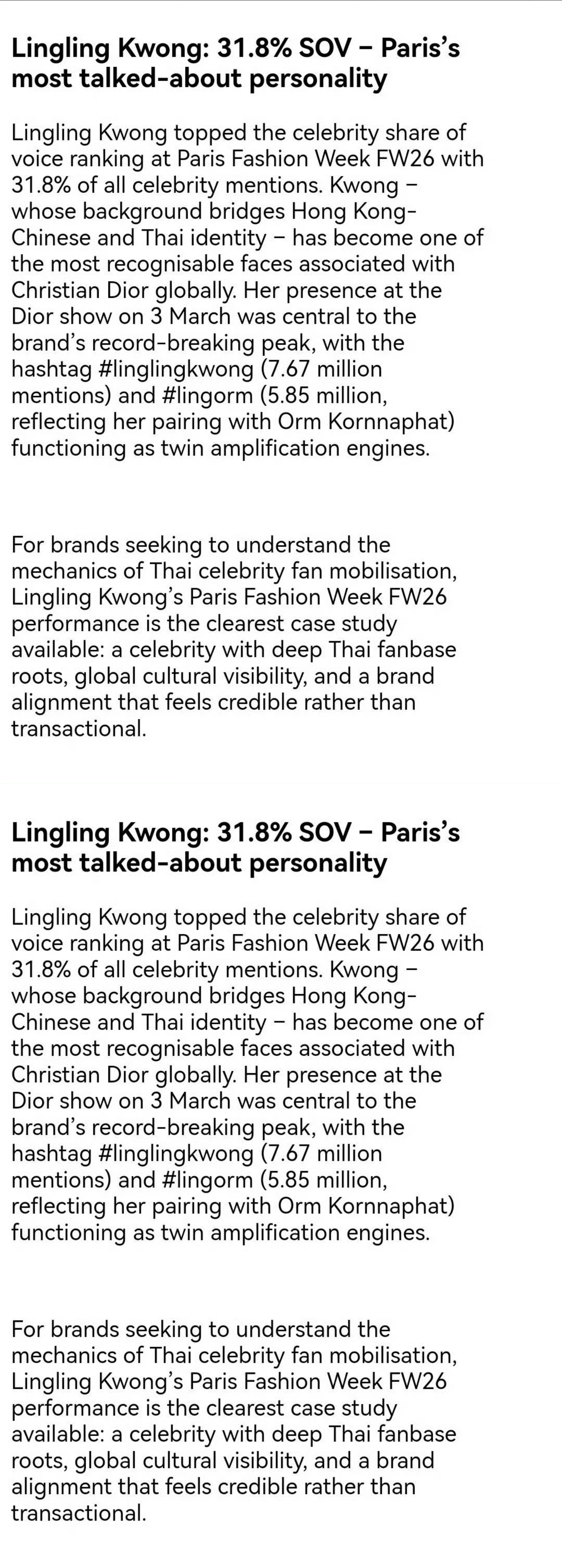 邝玲玲巴黎时装周名人声量第一邝玲玲巴黎时装周FW26 名人声量以31.8% 占据榜首!继去年LinglingKwong alone之后再次蝉联巴黎时装周TOP1,优秀👍🏻