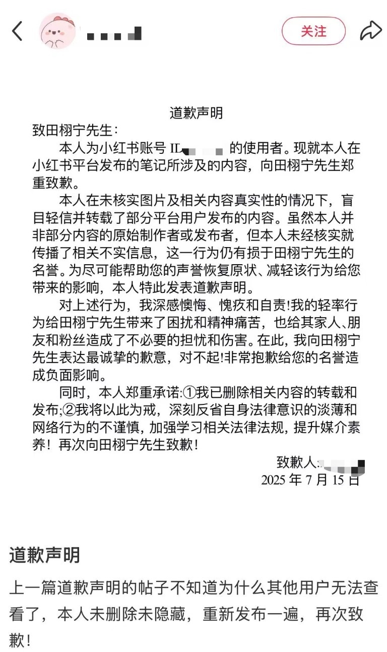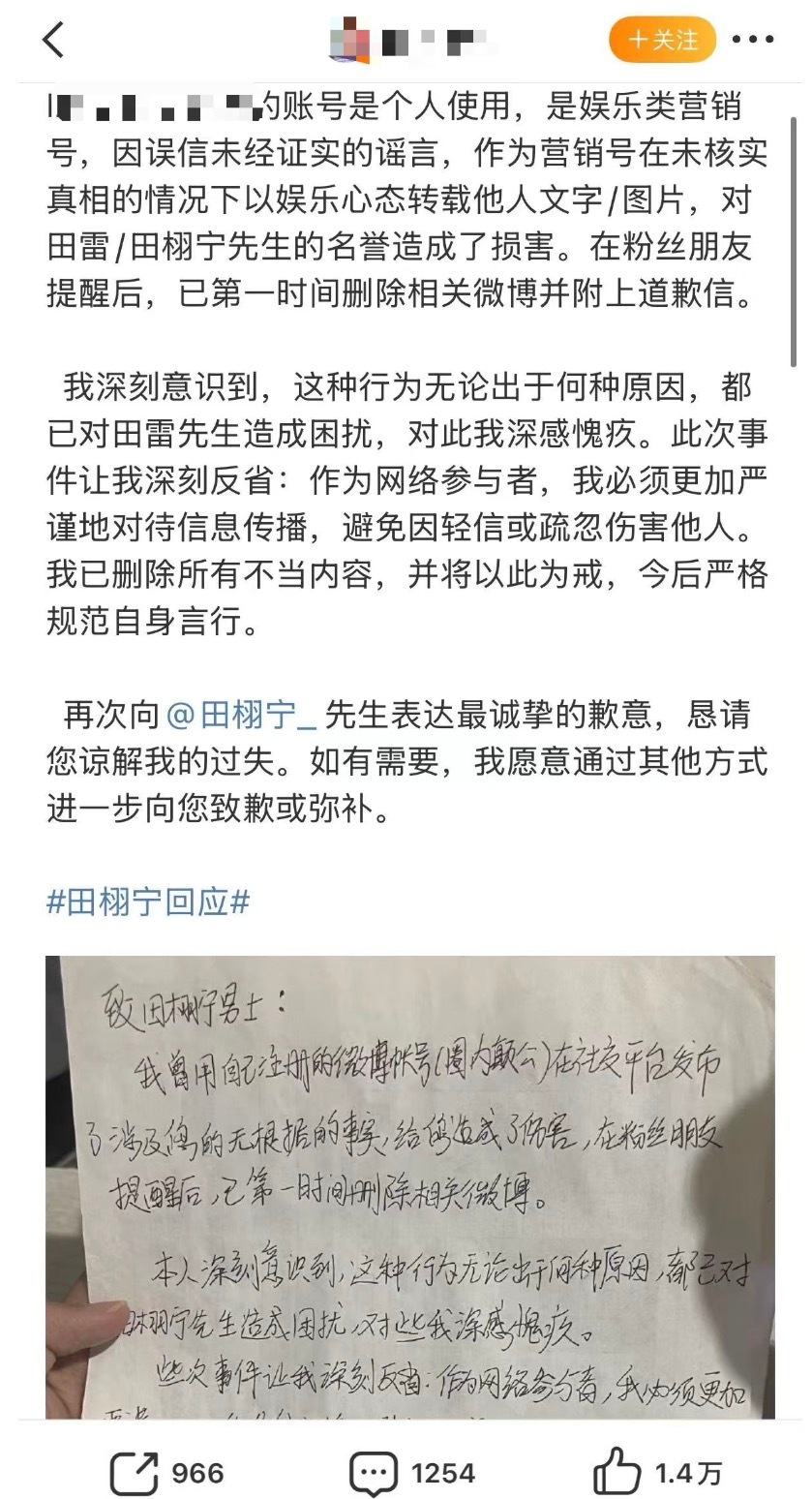 九成美告田栩宁好多人都不知道田栩宁告的这些账号道歉了,造谣0成本,公司盖章声明不