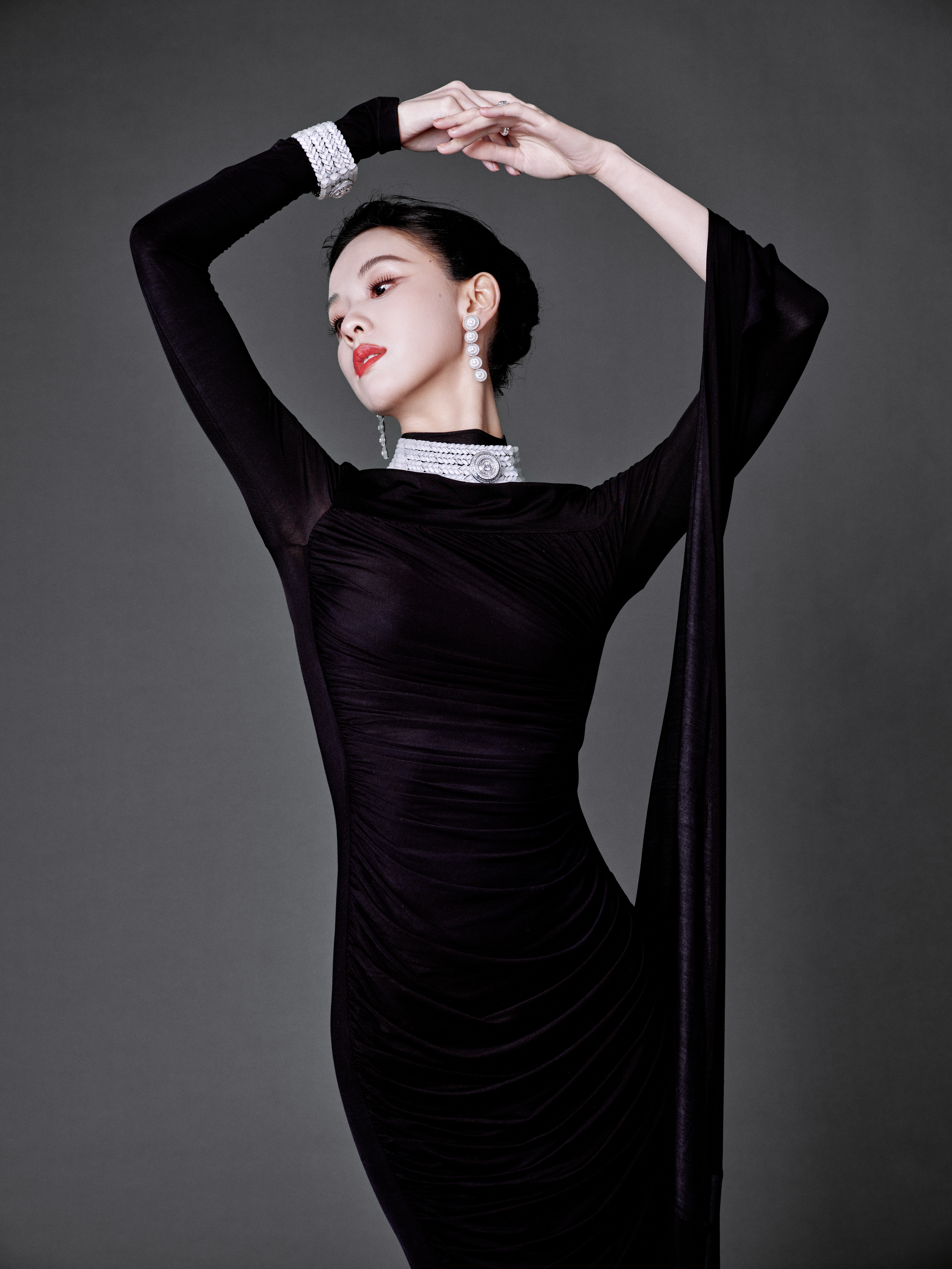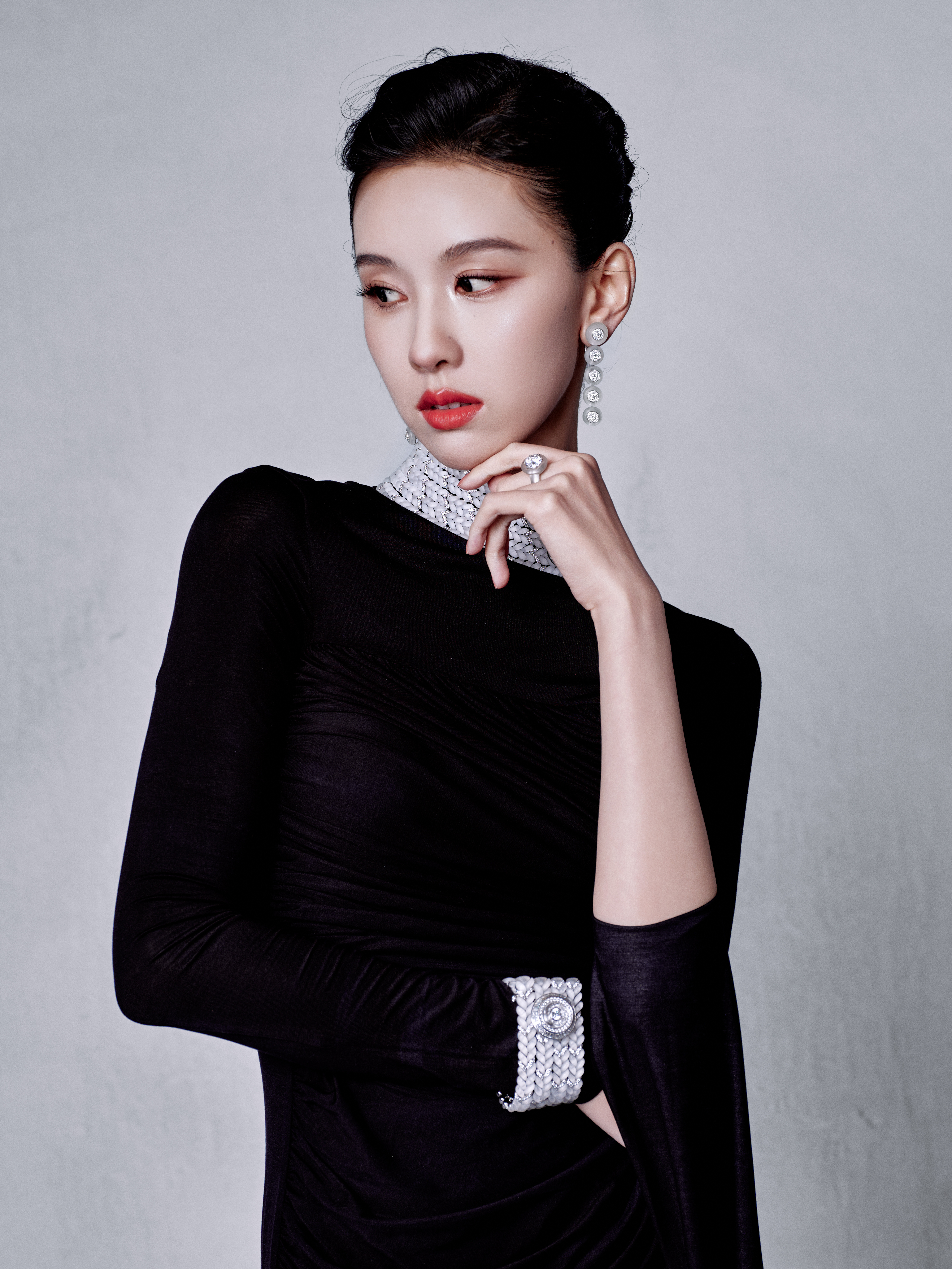 陈都灵今日出席Boucheron宝诗龙品牌活动造型大片,身着一袭黑色修身连衣裙搭