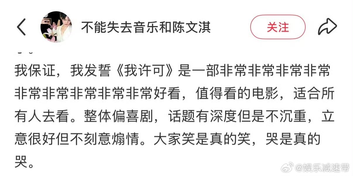 文淇我许可点映口碑 文淇新片点映口碑 《我许可》点映口碑好到飞起!女性创作团队太厉害,电影传递的价值观很积极,我要安利给身边所有人!