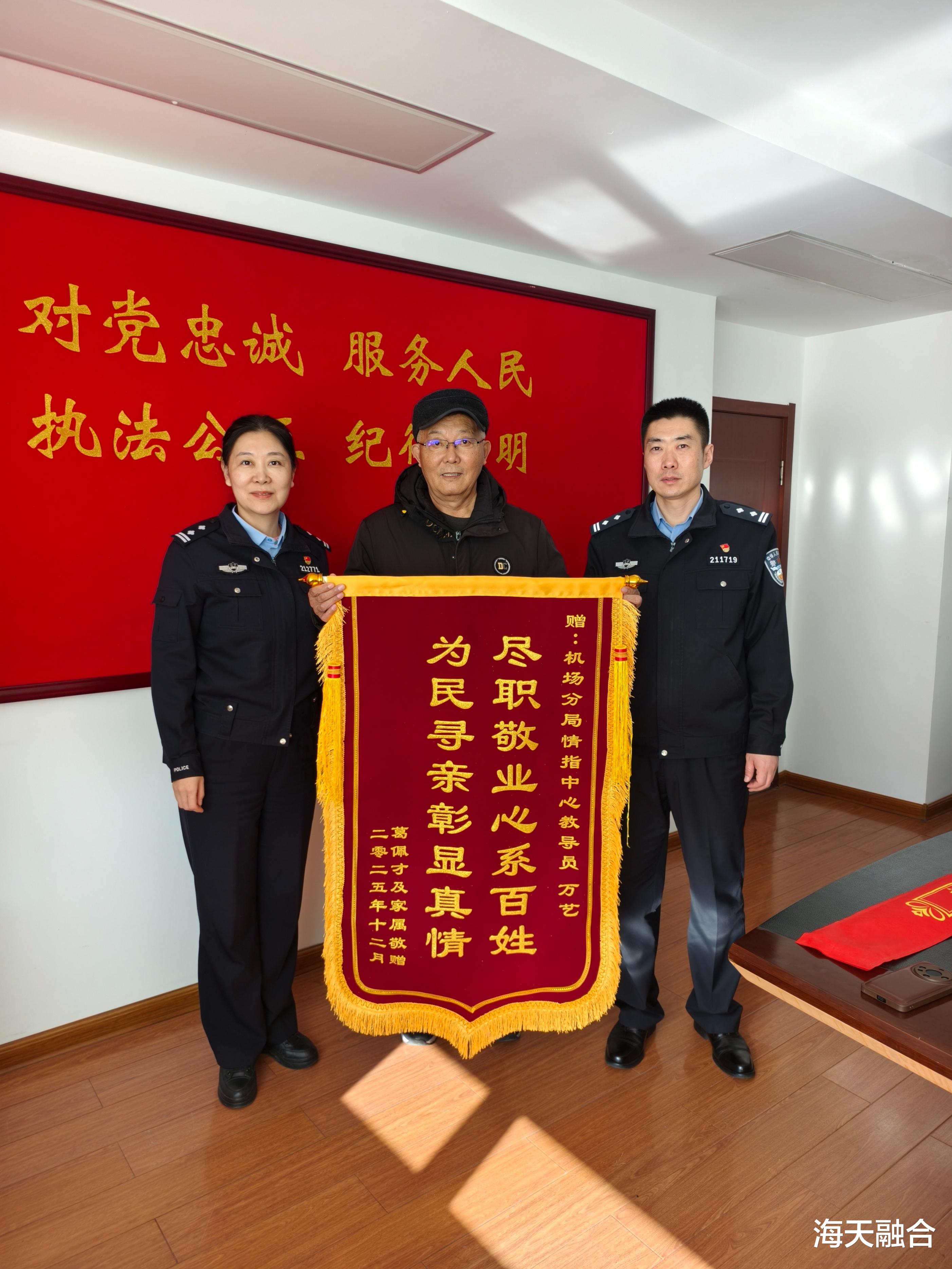 12月24日上午,老人家属专程来到机场分局,将一面印着“尽职敬业心系百姓 为民寻亲彰显真情”的锦旗送到民警手中,再次向机场公安高效负责的工作态度和热心为民的情怀表达由衷的感谢。