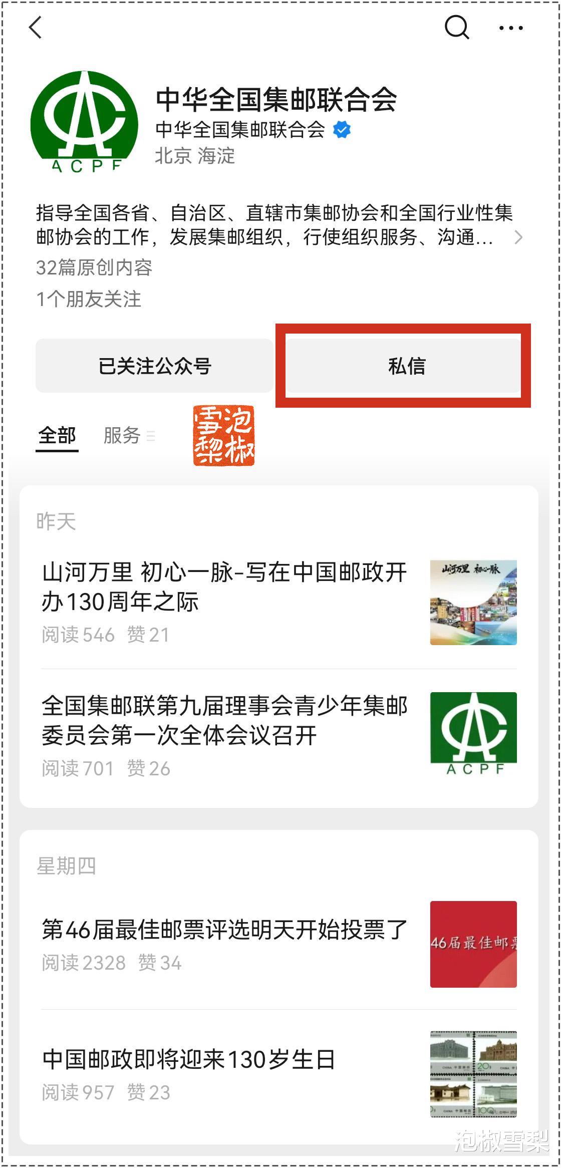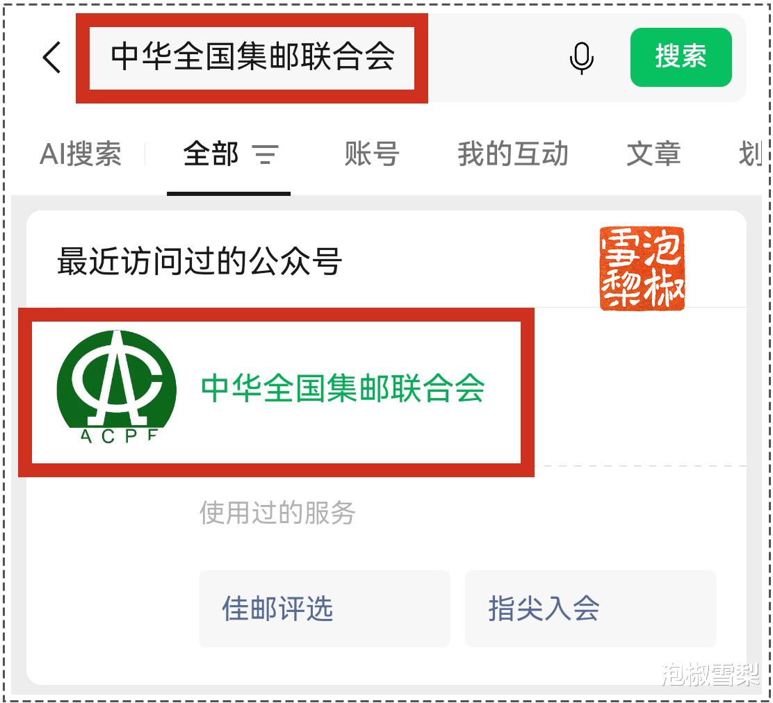 在显示出的搜索结果中,选择公众号“中华全国集邮联合会”,点击绿色的头像或名称,可进入公众号。
