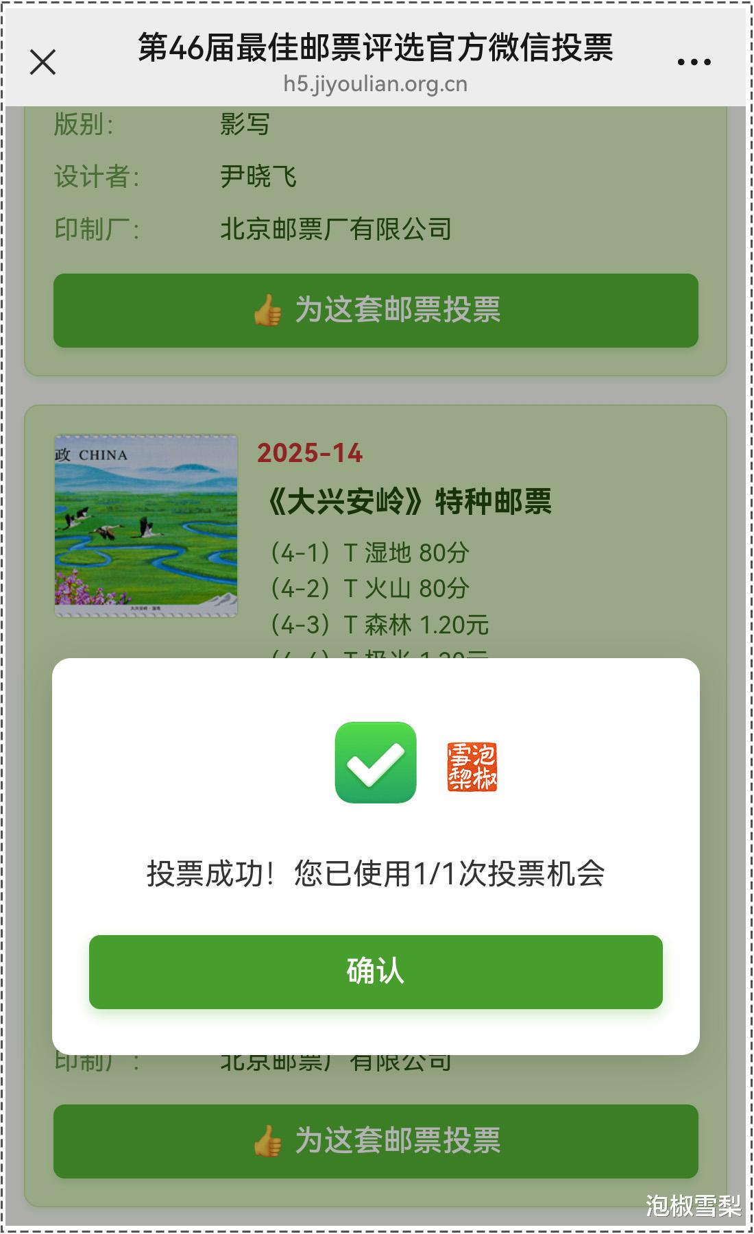 选择认为会获奖的邮票后,点击这套邮票下部的“为这套邮票投票”,会弹出提示“投票成功!您已使用1/1次投票机会”。
