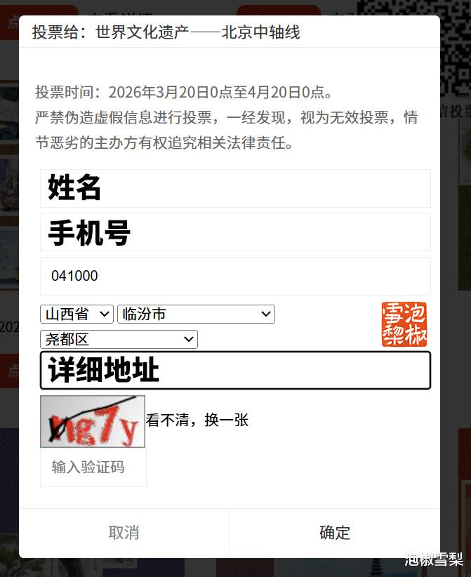 填完个人信息后,会提示个人有“1次”投票次数,也就是说一个账号只能为1套邮票投票。