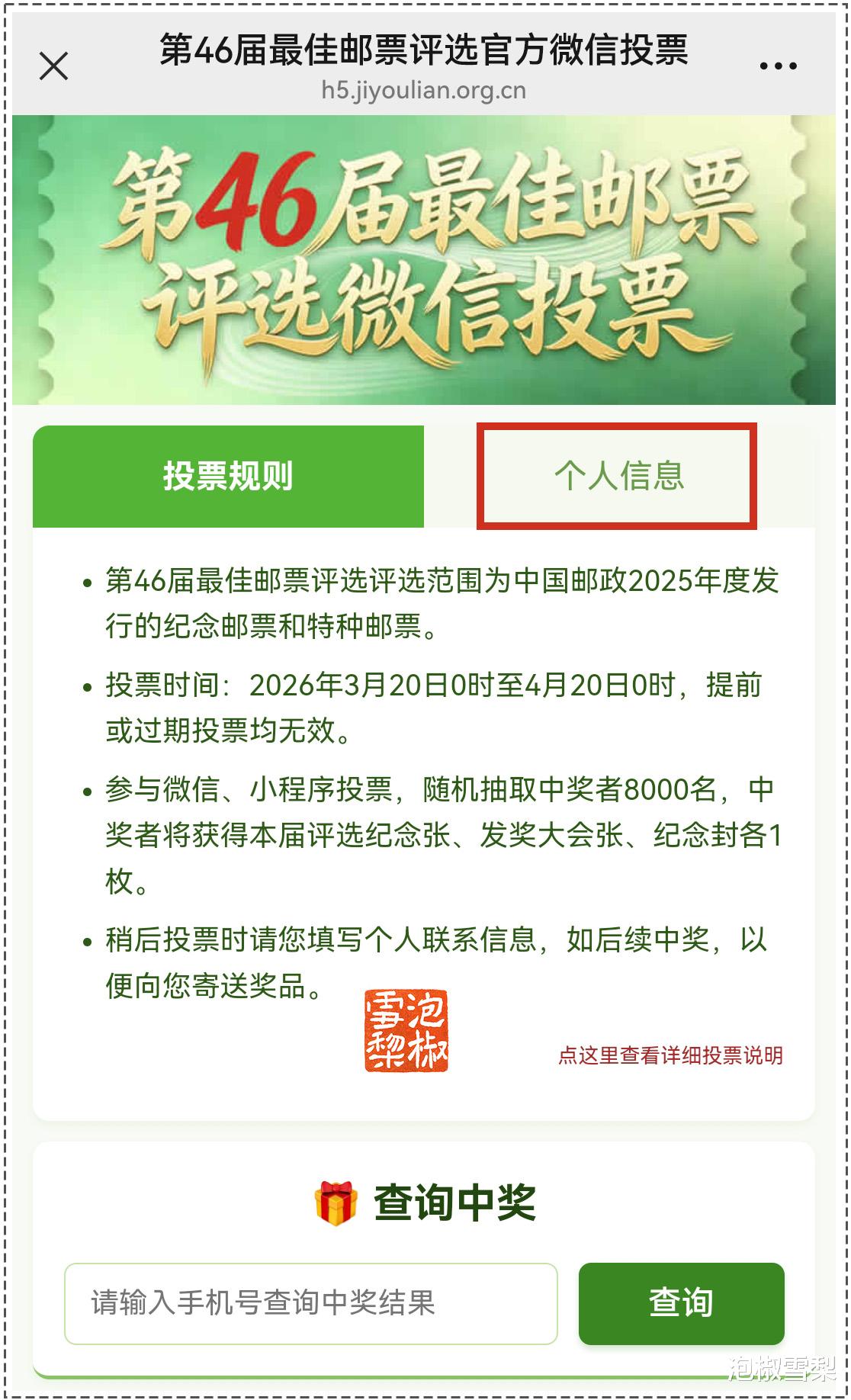 点击“佳邮评选”后,就是微信评选界面了,这里有详细的“投票规则”,在投票前,需点击右侧的“个人信息”,为获奖后发放奖品提供有效收货地址。