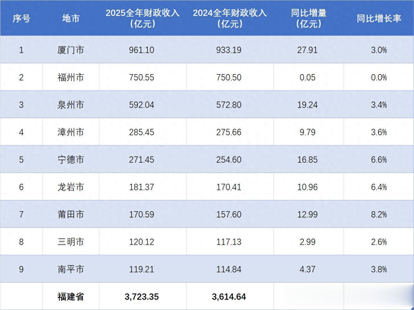 福建省地处东南,经济总规模虽无法与广东、江苏等省份相比,但其人均GDP却稳居全国前列。根据统计部门公布的数据,2025年1-12月份,福建全省共实现地方财政收入(一般公共预算收入)3723.35亿元,较上年同期增加108.71亿元,同比增长率为3.0%,增势稳健。