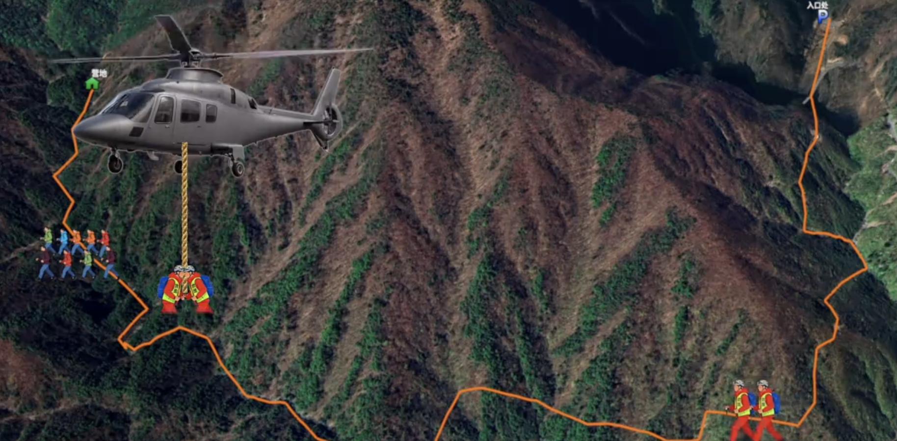 而另一支救援队乘直升机来到了事故上空。不过由于事发地位于V字形的山谷底部,所以它没有足够的空间让直升机降落。为了能尽快解救死者,救援队决定先用绳子放下两名救援人员。于是,直升机就悬停在空中。然后两名救援人员顺着绳子一点点的靠近地面。
