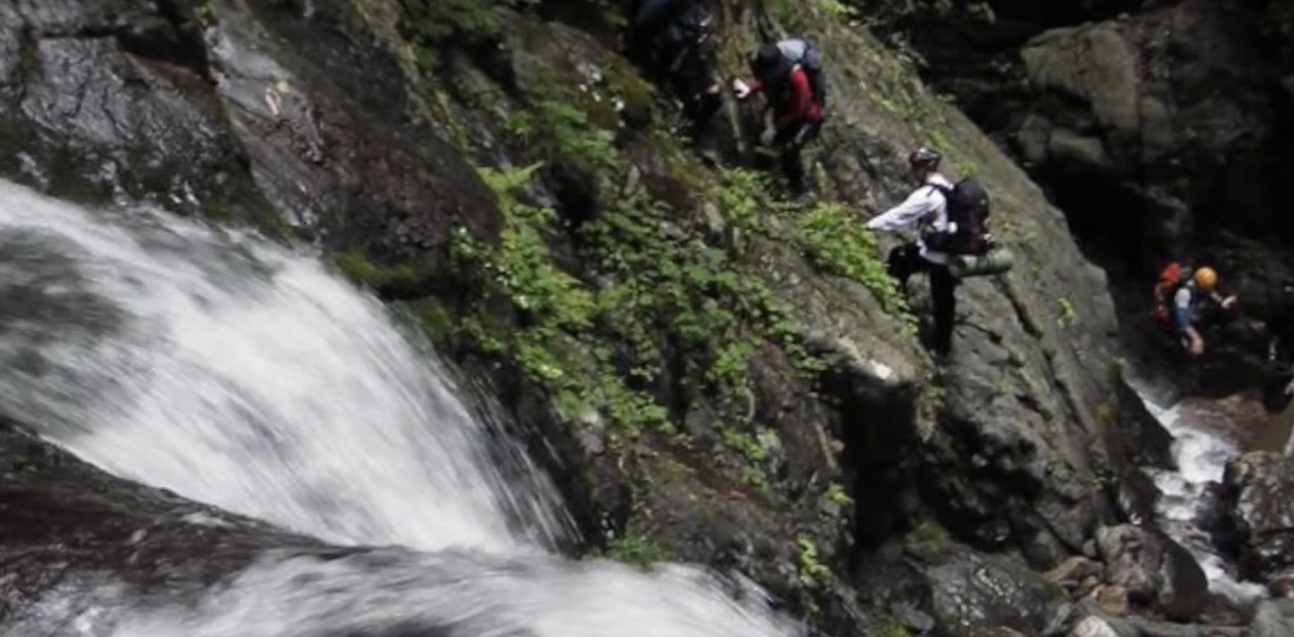 这个瀑布的宽和高都是3米左右,队员们需要沿着岩壁一点点爬上去。为了确保游客们的安全,向导提醒大家,一定要把安全绳系上。但可能是由于赶时间,所以向导并没有逐个检查安全绳是否系好。