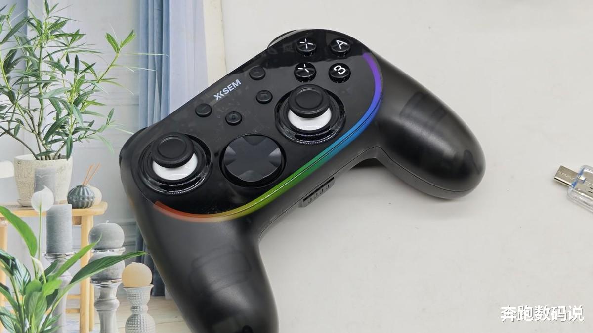 手柄配备10种自定义RGB灯效,集中在握把与品牌Logo处,亮度三级可调,支持随游戏节奏变换。灯效色彩过渡自然无频闪,功耗控制出色,开启后对续航影响极小,夜晚游戏氛围感拉满。包装附赠Type-C充电线、2.4G接收器、摇杆保护帽等,细节贴心。