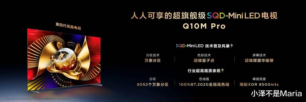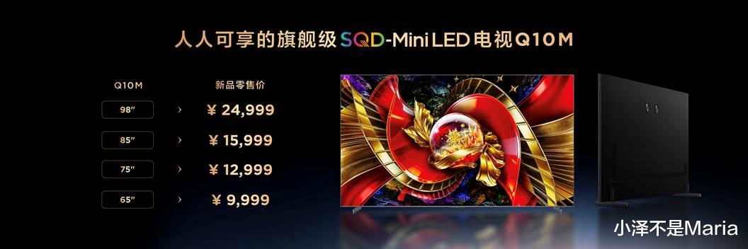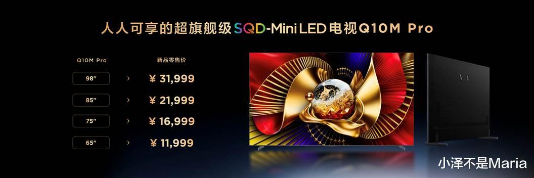 与此同时,人人可享的SQD-Mini LED旗舰级产品TCL Q10M也一并上市,同样搭载SQD-Mini LED技术,拥有碾压同价位产品的100% BT.2020全局高色域,配备最新的超级量子点技术,屏幕也直接一升到顶,配备超级蝶翼华曜屏,98吋、85吋、 75吋、65吋零售价分别为24999元、15999元、12999元、9999元。作为技术普惠的标杆之作,Q10M代表着TCL大幅降低了SQD-Mini LED体验门槛,让用户真正触手可及。