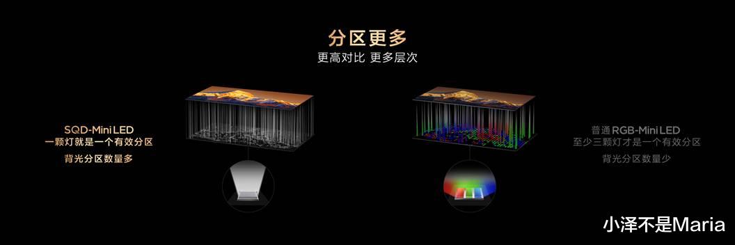 而TCL Q10M Pro的万象分区作为系统级的极致控光方案,实现了“一区顶多区”的质变效果。其98吋、85吋、75吋、65吋版本分别拥有8052、5832、4608、3528个万象分区,控光效果远超普通分区。SQD-Mini LED单灯即为一个有效分区,而RGB-Mini LED需3颗灯组成一个分区,同等成本下Q10M Pro的物理分区数量是RGB-Mini LED 的3倍以上,控光精度大幅提升。万象分区技术与拥有行业最高原生对比度的超级蝶翼华曜屏组合,带来了黑场更深邃、白场更纯净,明暗层次极致分明的超高对比度画质表现。