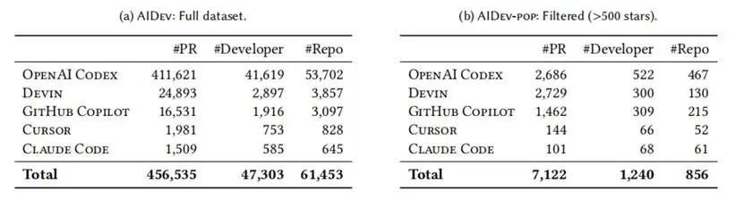 表丨AIDev 数据集(完整数据集)与 AIDev-pop(GitHub 上大于 500 星的仓库)的统计分析(来源:arXiv)