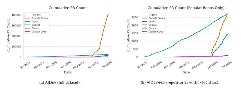 图丨自主编码 Agent 在所有代码库及热门代码库中的累积 PR 量(来源:arXiv)