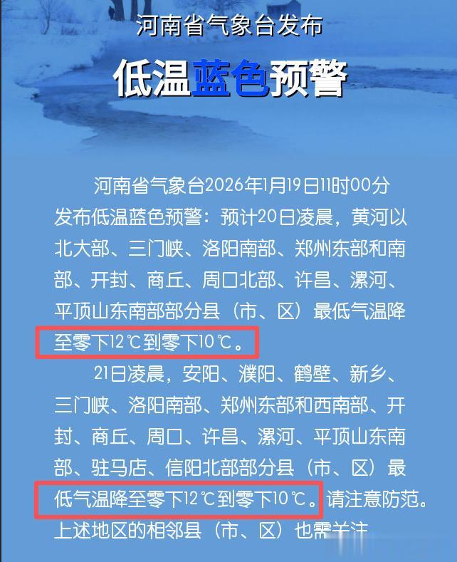 根据气象预报,在今天晚上至明天,河南好多地区的最低气温将会降低到零下12℃,最高气温也在零下5℃,这样低的气温,真的是好多年遇不到呀。