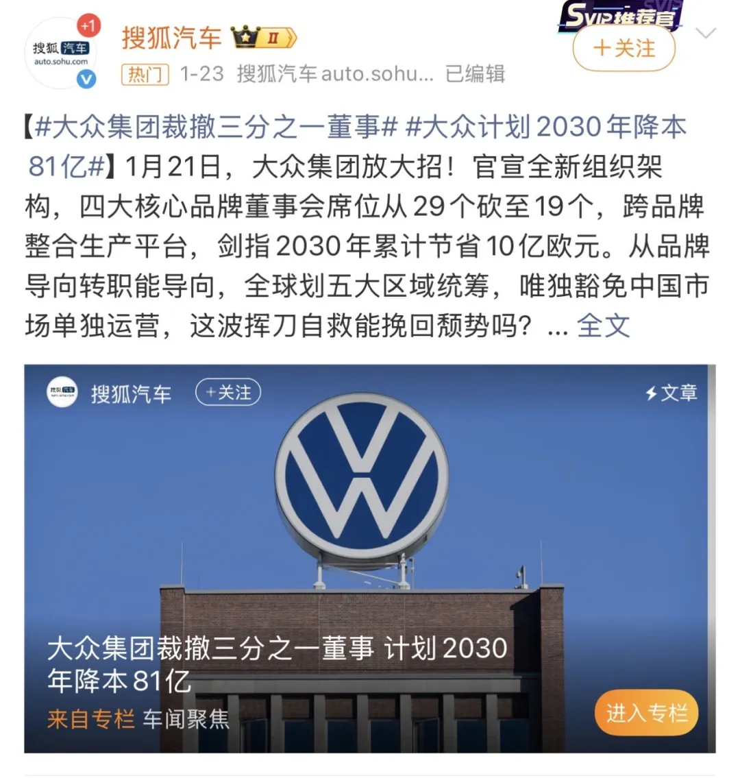 面对此挑战,大众无法再按部就班。近期,大众集团宣布将在2026年夏季前,把核心品牌集团的董事会成员数量削减约三分之一,从29个缩减至19个。