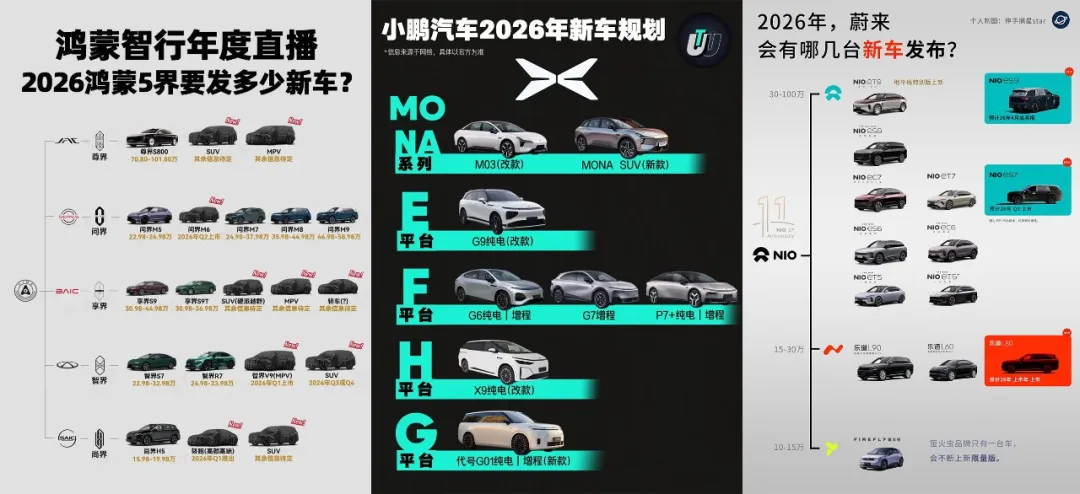 图/2026年鸿蒙智行、小鹏、蔚来新车规划