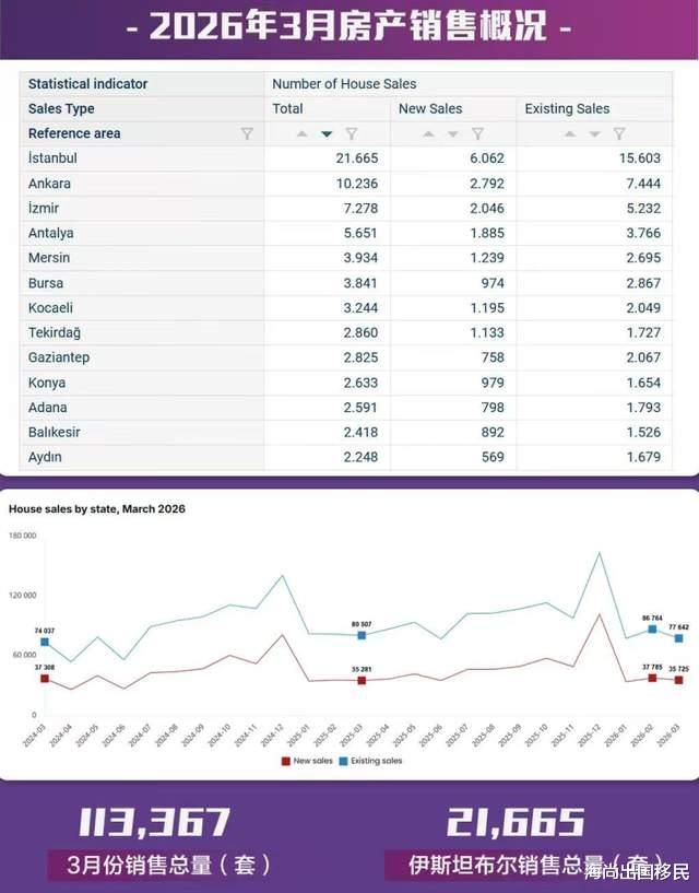 土耳其统计局(TurkStat)最新发布的数据显示,3月份土耳其共售出113,367套房屋,同比下降2.1%。相比之下,2025年3月的房屋销售量为115,788套。伊斯坦布尔以21,665套的销量领跑市场,其次是安卡拉(10,236套)和伊兹密尔(7,278套)。