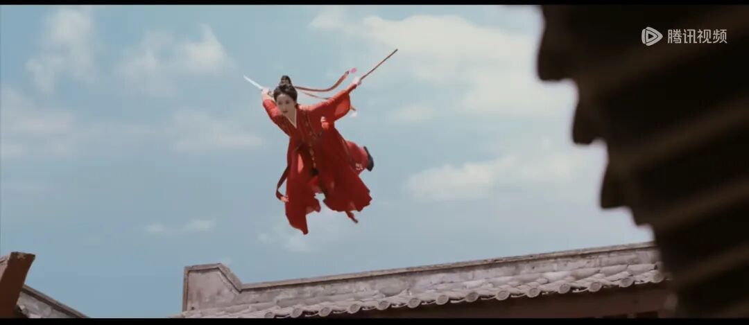 仔细一看,原来是一位红衣女子从高处飞身而下,落地后随风舞剑,在擂台上身形飘逸,英姿飒爽。