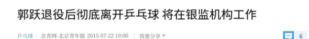 北青网-北京青年报——郭跃退役后彻底离开乒乓球 将在银监机构工作