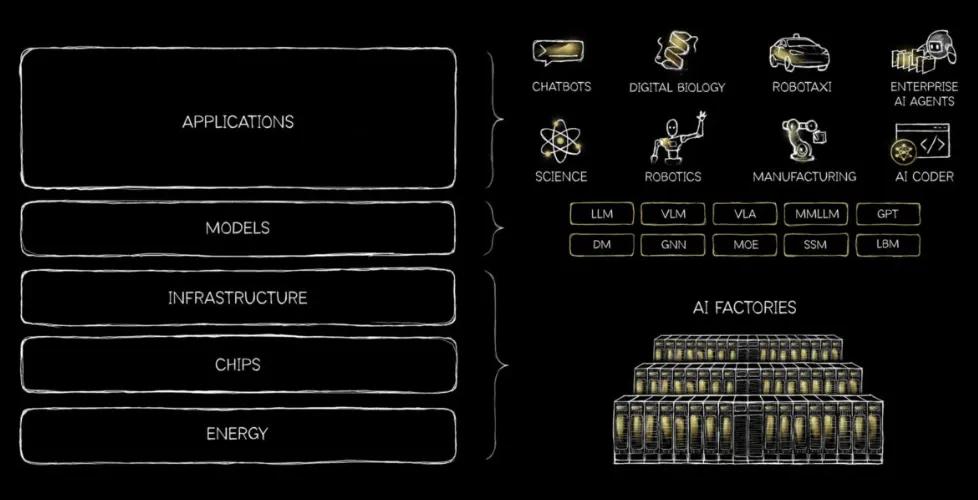 3月初,NVIDIA创始人黄仁勋抛出“五层蛋糕”的AI基建架构,从能源、芯片一直延伸到应用,认为算力需求的增长远未触顶。同时他提出,“物理AI是人工智能的下一个浪潮”。