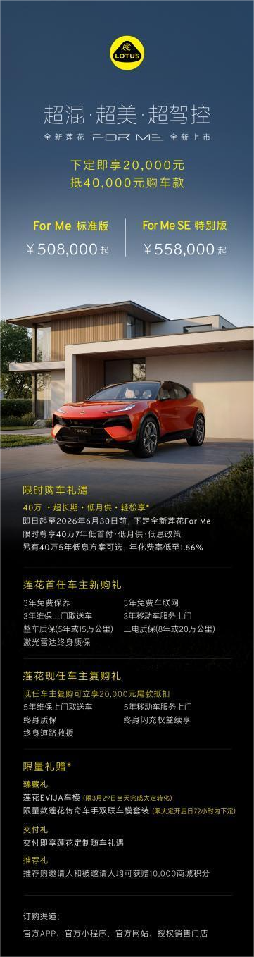 【2026年3月29日,北京】今日,莲花跑车宣布旗下超跑SUV全新莲花For Me正式上市,并于3月30日开启首批交付。新车推出标准版和SE特别版两款车型,售价分别为50.8万元和55.8万元。