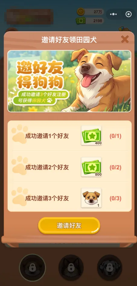 当用户达到一定等级后,就可以开放田园犬的领养。