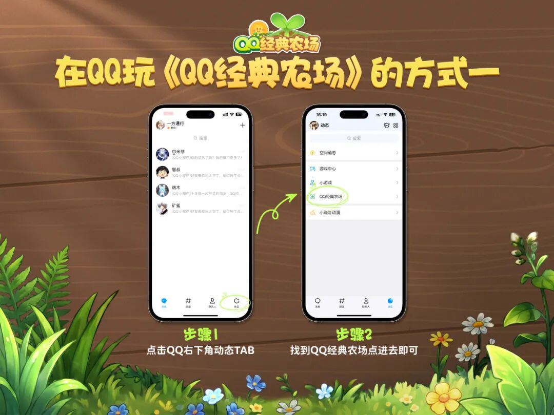 点击 QQ 右下角的动态 Tab,找到「QQ 经典农场」,进入即可。
