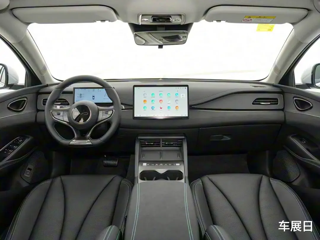 内饰具有海洋家族风格,门板和座椅有大量曲线设计,还有少量蓝色点缀。配备全液晶仪表盘和15.6英寸中控屏,圆形换挡区域,小巧拨杆挡把,功能按键环绕挡把。车身长宽高分别为4830/1875/1495mm,轴距2790mm。